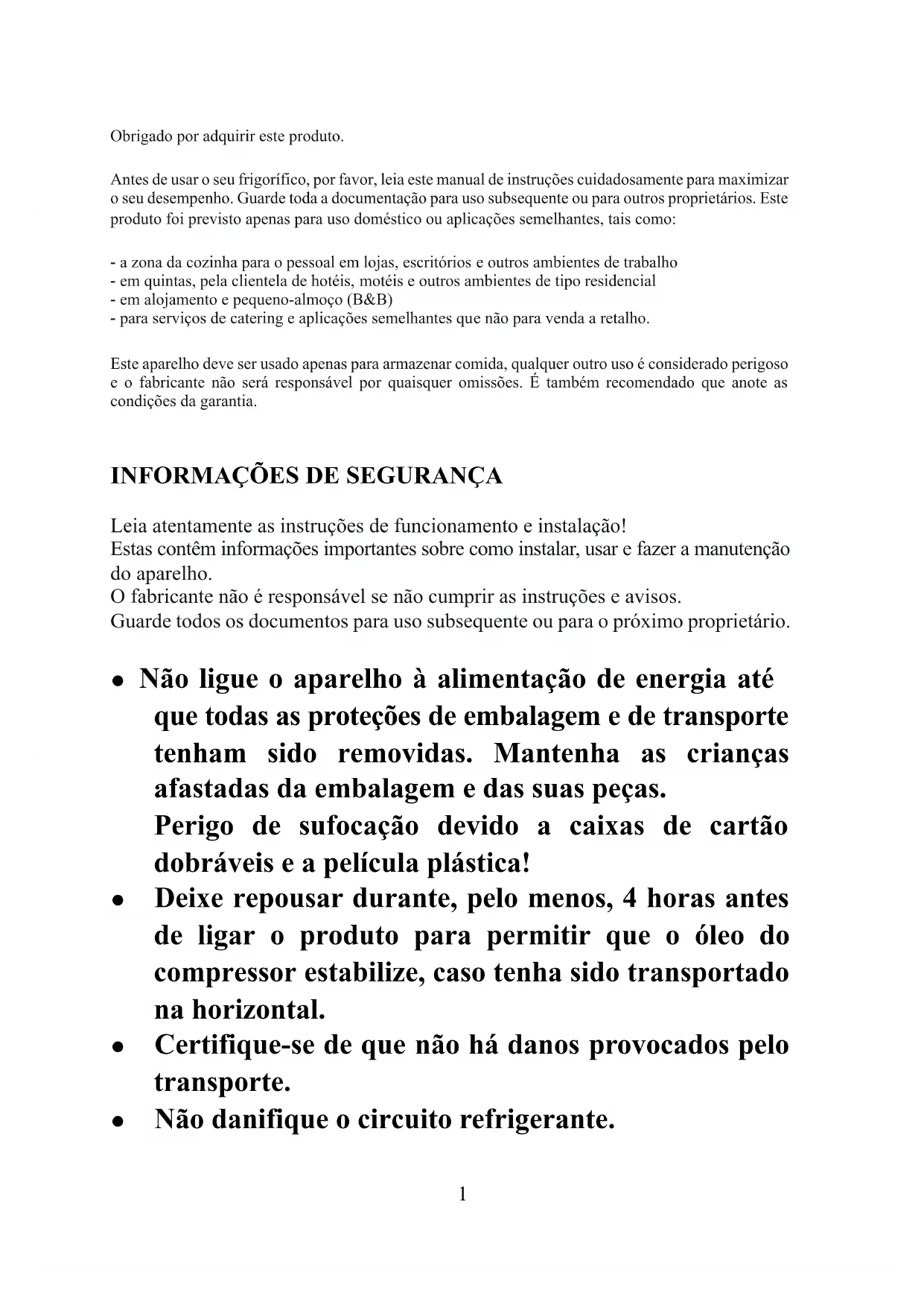 Obrigado por adquirir este produto. Antes de usar o seu frigorífico, por favor, leia este manual de instruções cuidadosamente para maximizar o seu desempenho. Guarde toda a documentação para uso subsequente ou para outros proprietários. Este produto foi previsto apenas para uso doméstico ou aplicações semelhantes, tais como: - a zona da cozinha para o pessoal em lojas, escritórios e outros ambientes de trabalho - em quintas, pela clientela de hotéis, motéis e outros ambientes de tipo residencial - em alojamento e pequeno-almoço (B&B) - para serviços de catering e aplicações semelhantes que não para venda a retalho. Este aparelho deve ser usado apenas para armazenar comida, qualquer outro uso é considerado perigoso e o fabricante não será responsável por quaisquer omissões. É também recomendado que anote as condições da garantia.
