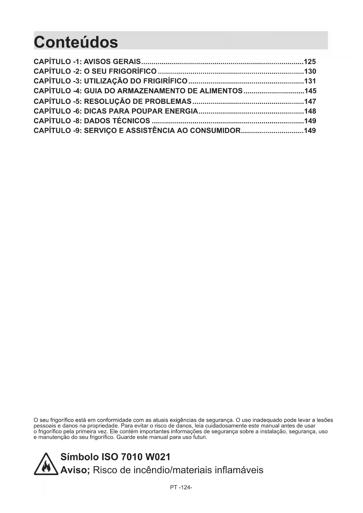 O seu frigoríco está em conformidade com as atuais exigências de segurança. O uso inadequado pode levar a lesões pessoais e danos na propriedade. Para evitar o risco de danos, leia cuidadosamente este manual antes de usar o frigoríco pela primeira vez. Ele contém importantes informações de segurança sobre a instalação, segurança, uso e manutenção do seu frigoríco. Guarde este manual para uso futuri. Símbolo ISO 7010 W021 Aviso; Risco de incêndio/materiais inamáveisPT -125-