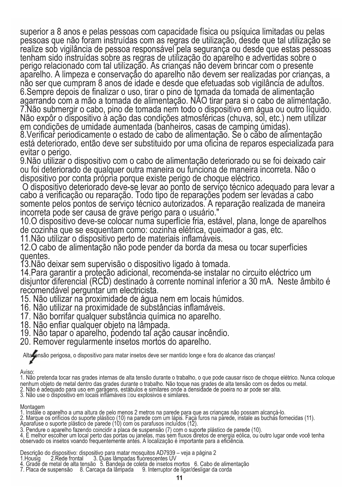 4. É melhor escolher um local perto das portas ou janelas, mas sem fluxos diretos de energia eólica, ou outro lugar onde você tenha observado os insetos voando frequentemente antes. A localização é importante para a eficiência. Descrição do dispositivo: dispositivo para matar mosquitos AD7939 – veja a página 2 1.Housig 2.Rede frontal 3. Duas lâmpadas fluorescentes UV