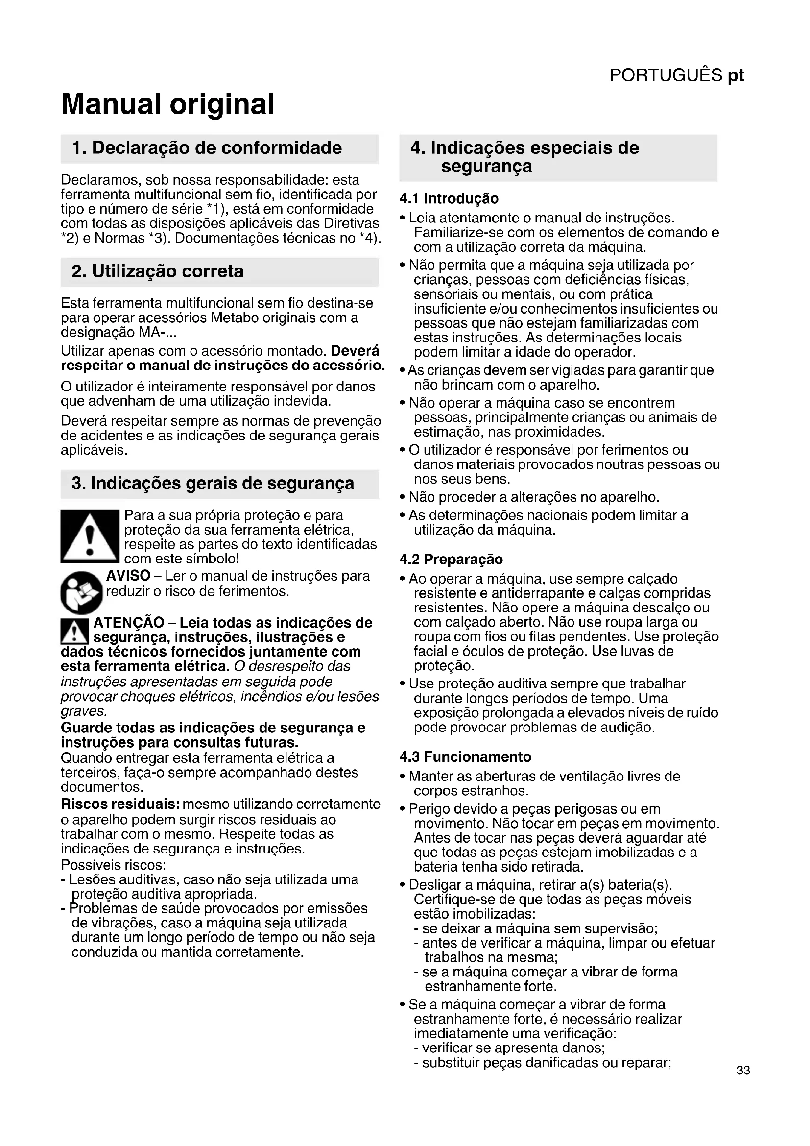 Manual original Declaramos, sob nossa responsabilidade: esta ferramenta multifuncional sem fio, identificada por tipo e número de série *1), está em conformidade com todas as disposições aplicáveis das Diretivas *2) e Normas *3). Documentações técnicas no *4). Esta ferramenta multifuncional sem fio destina-se para operar acessórios Metabo originais com a designação MA-... Utilizar apenas com o acessório montado. Deverá respeitar o manual de instruções do acessório. O utilizador é inteiramente responsável por danos que advenham de uma utilização indevida. Deverá respeitar sempre as normas de prevenção de acidentes e as indicações de segurança gerais aplicáveis. Para a sua própria proteção e para proteção da sua ferramenta elétrica, respeite as partes do texto identificadas com este símbolo! AVISO – Ler o manual de instruções para reduzir o risco de ferimentos. ATENÇÃO – Leia todas as indicações de segurança, instruções, ilustrações e dados técnicos fornecidos juntamente com esta ferramenta elétrica. O desrespeito das instruções apresentadas em seguida pode provocar choques elétricos, incêndios e/ou lesões graves. Guarde todas as indicações de segurança e instruções para consultas futuras. Quando entregar esta ferramenta elétrica a terceiros, faça-o sempre acompanhado destes documentos. Riscos residuais: mesmo utilizando corretamente o aparelho podem surgir riscos residuais ao trabalhar com o mesmo. Respeite todas as indicações de segurança e instruções. Possíveis riscos: - Lesões auditivas, caso não seja utilizada uma proteção auditiva apropriada. - Problemas de saúde provocados por emissões de vibrações, caso a máquina seja utilizada durante um longo período de tempo ou não seja conduzida ou mantida corretamente.