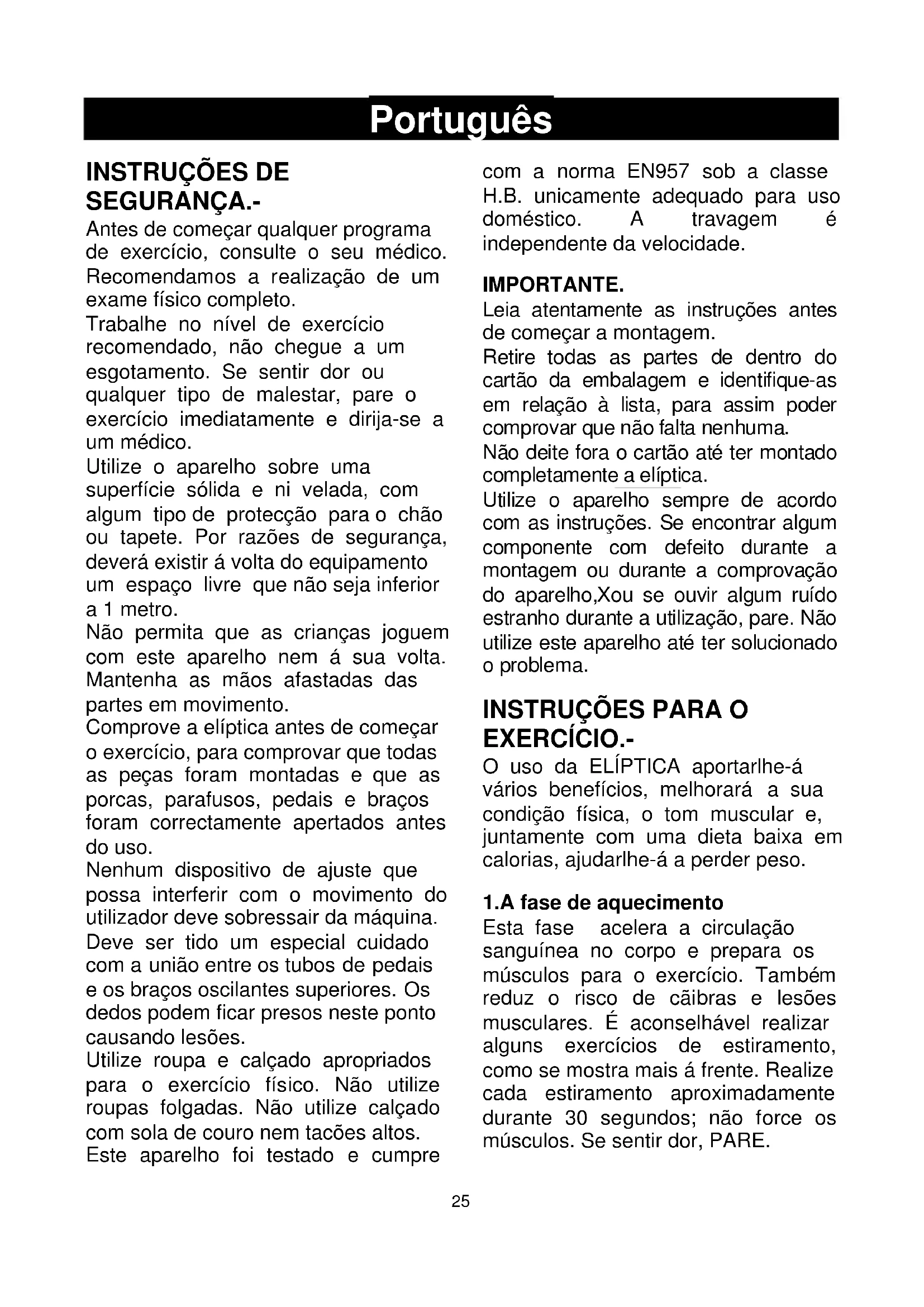SEGURANÇA.- Antes de começar qualquer programa de exercício, consulte o seu médico. Recomendamos a realização de um exame físico completo. Trabalhe no nível de exercício recomendado, não chegue a um esgotamento. Se sentir dor ou qualquer tipo de malestar, pare o exercício imediatamente e dirija-se a um médico. Utilize o aparelho sobre uma superfície sólida e ni velada, com algum tipo de protecção para o chão ou tapete. Por razões de segurança, deverá existir á volta do equipamento um espaço livre que não seja inferior a 1 metro. Não permita que as crianças joguem com este aparelho nem á sua volta. Mantenha as mãos afastadas das partes em movimento. Comprove a elíptica antes de começar o exercício, para comprovar que todas as peças foram montadas e que as porcas, parafusos, pedais e braços foram correctamente apertados antes do uso. Nenhum dispositivo de ajuste que possa interferir com o movimento do utilizador deve sobressair da máquina. Deve ser tido um especial cuidado com a união entre os tubos de pedais e os braços oscilantes superiores. Os dedos podem ficar presos neste ponto causando lesões. Utilize roupa e calçado apropriados para o exercício físico. Não utilize roupas folgadas. Não utilize calçado com sola de couro nem tacões altos. Este aparelho foi testado e cumpre com a norma EN957 sob a classe H.B. unicamente adequado para uso doméstico. A travagem é independente da velocidade. IMPORTANTE. Leia atentamente as instruções antes de começar a montagem. Retire todas as partes de dentro do cartão da embalagem e identifique-as em relação à lista, para assim poder comprovar que não falta nenhuma. Não deite fora o cartão até ter montado completamente a elíptica. Utilize o aparelho sempre de acordo com as instruções. Se encontrar algum componente com defeito durante a montagem ou durante a comprovação do aparelho,Xou se ouvir algum ruído estranho durante a utilização, pare. Não utilize este aparelho até ter solucionado o problema.