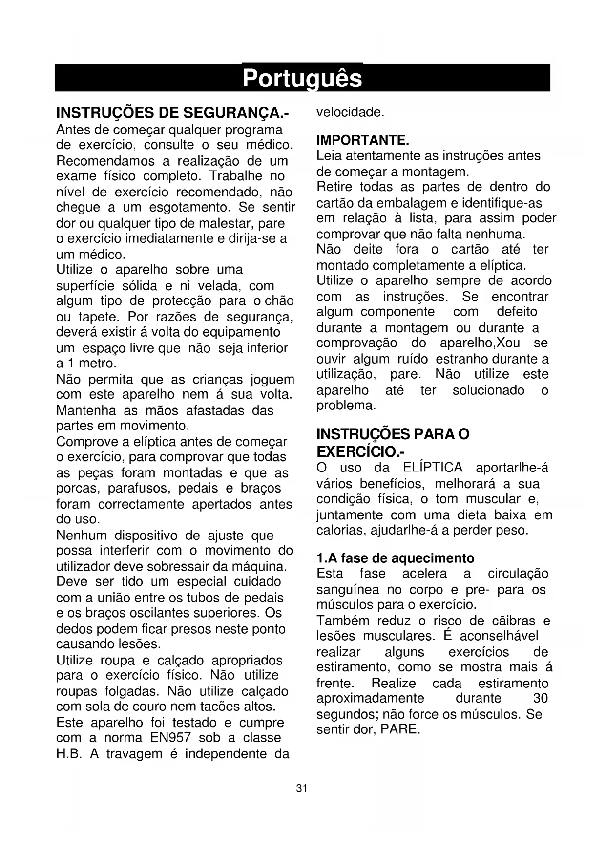 Antes de começar qualquer programa de exercício, consulte o seu médico. Recomendamos a realização de um exame físico completo. Trabalhe no nível de exercício recomendado, não chegue a um esgotamento. Se sentir dor ou qualquer tipo de malestar, pare o exercício imediatamente e dirija-se a um médico. Utilize o aparelho sobre uma superfície sólida e ni velada, com algum tipo de protecção para o chão ou tapete. Por razões de segurança, deverá existir á volta do equipamento um espaço livre que não seja inferior a 1 metro. Não permita que as crianças joguem com este aparelho nem á sua volta. Mantenha as mãos afastadas das partes em movimento. Comprove a elíptica antes de começar o exercício, para comprovar que todas as peças foram montadas e que as porcas, parafusos, pedais e braços foram correctamente apertados antes do uso. Nenhum dispositivo de ajuste que possa interferir com o movimento do utilizador deve sobressair da máquina. Deve ser tido um especial cuidado com a união entre os tubos de pedais e os braços oscilantes superiores. Os dedos podem ficar presos neste ponto causando lesões. Utilize roupa e calçado apropriados para o exercício físico. Não utilize roupas folgadas. Não utilize calçado com sola de couro nem tacões altos. Este aparelho foi testado e cumpre com a norma EN957 sob a classe H.B. A travagem é independente da velocidade. IMPORTANTE. Leia atentamente as instruções antes de começar a montagem. Retire todas as partes de dentro do cartão da embalagem e identifique-as em relação à lista, para assim poder comprovar que não falta nenhuma. Não deite fora o cartão até ter montado completamente a elíptica. Utilize o aparelho sempre de acordo com as instruções. Se encontrar algum componente com defeito durante a montagem ou durante a comprovação do aparelho,Xou se ouvir algum ruído estranho durante a utilização, pare. Não utilize este aparelho até ter solucionado o problema.