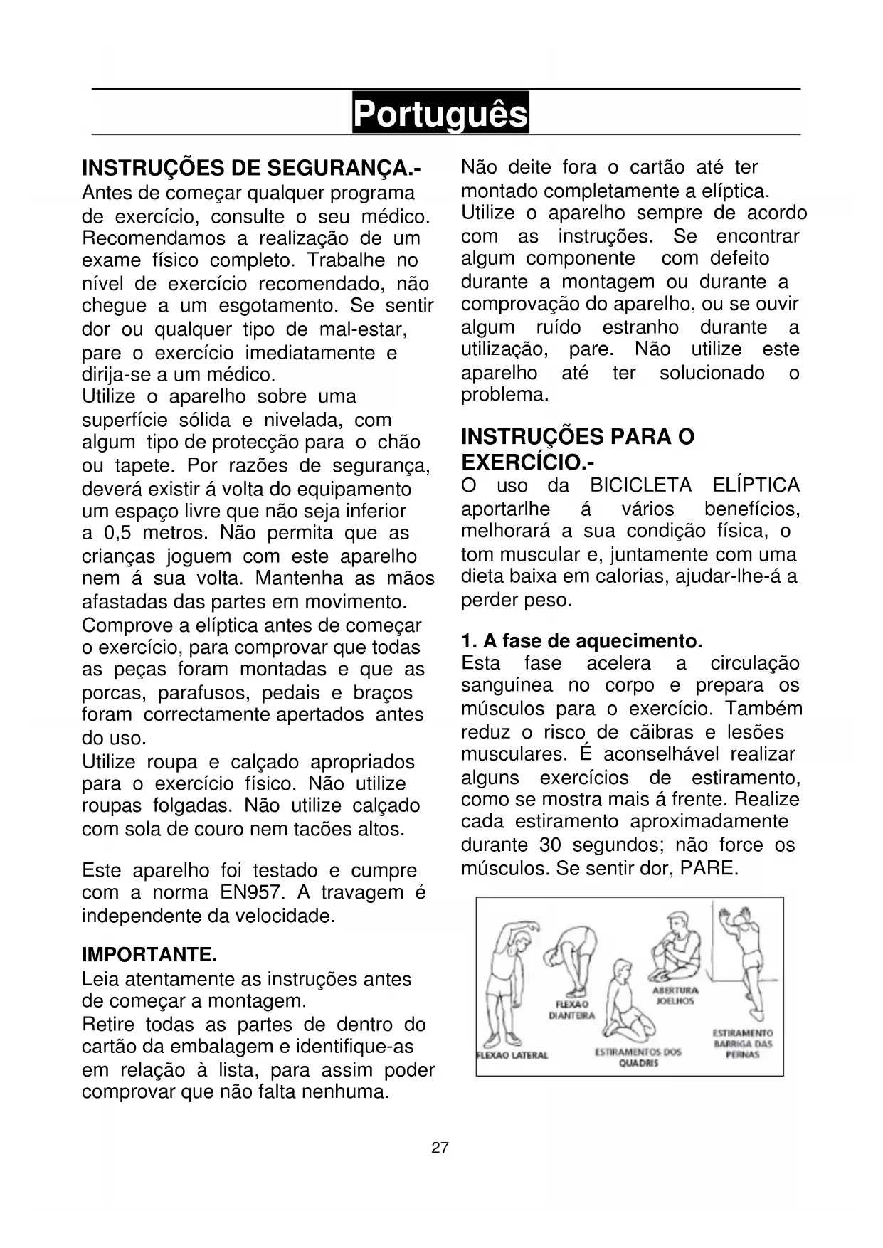 Antes de começar qualquer programa de exercício, consulte o seu médico. Recomendamos a realização de um exame físico completo. Trabalhe no nível de exercício recomendado, não chegue a um esgotamento. Se sentir dor ou qualquer tipo de mal-estar, pare o exercício imediatamente e dirija-se a um médico. Utilize o aparelho sobre uma superfície sólida e nivelada, com algum tipo de protecção para o chão ou tapete. Por razões de segurança, deverá existir á volta do equipamento um espaço livre que não seja inferior a 0,5 metros. Não permita que as crianças joguem com este aparelho nem á sua volta. Mantenha as mãos afastadas das partes em movimento. Comprove a elíptica antes de começar o exercício, para comprovar que todas as peças foram montadas e que as porcas, parafusos, pedais e braços foram correctamente apertados antes do uso. Utilize roupa e calçado apropriados para o exercício físico. Não utilize roupas folgadas. Não utilize calçado com sola de couro nem tacões altos. Este aparelho foi testado e cumpre com a norma EN957. A travagem é independente da velocidade. IMPORTANTE. Leia atentamente as instruções antes de começar a montagem. Retire todas as partes de dentro do cartão da embalagem e identifique-as em relação à lista, para assim poder comprovar que não falta nenhuma. Não deite fora o cartão até ter montado completamente a elíptica. Utilize o aparelho sempre de acordo com as instruções. Se encontrar algum componente com defeito durante a montagem ou durante a comprovação do aparelho, ou se ouvir algum ruído estranho durante a utilização, pare. Não utilize este aparelho até ter solucionado o problema.