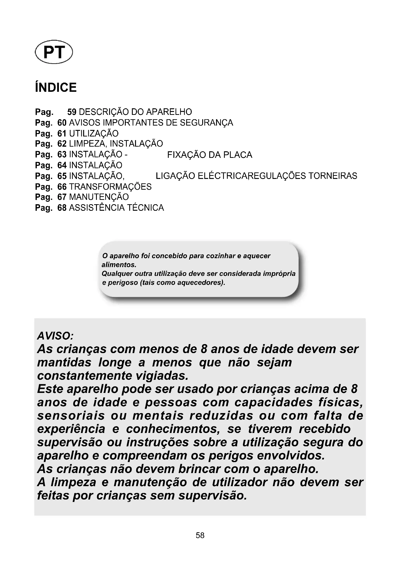 Pag. 66 TRANSFORMAÇÕES Pag. 67 MANUTENÇÃO Pag. 68 ASSISTÊNCIA TÉCNICA AVISO: As crianças com menos de 8 anos de idade devem ser mantidas longe a menos que não sejam constantemente vigiadas. Este aparelho pode ser usado por crianças acima de 8 anos de idade e pessoas com capacidades físicas, sensoriais ou mentais reduzidas ou com falta de experiência e conhecimentos, se tiverem recebido supervisão ou instruções sobre a utilização segura do aparelho e compreendam os perigos envolvidos. As crianças não devem brincar com o aparelho. A limpeza e manutenção de utilizador não devem ser feitas por crianças sem supervisão.59