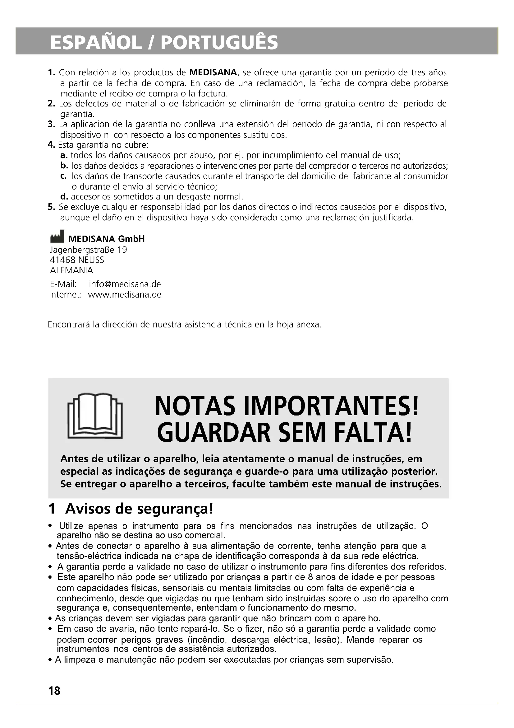 aunque el daño en el dispositivo haya sido considerado como una reclamación justificada.MEDISANA GmbH Jagenbergstraße 1941468 NEUSSALEMANIAE-Mail: info@medisana.de nternet: www.medisana.deEncontrará la dirección de nuestra asistencia técnica en la hoja anexa. NOTAS IMPORTANTES! GUARDAR SEM FALTA! Antes de utilizar o aparelho, leia atentamente o manual de instruções, em especial as indicações de segurança e guarde-o para uma utilização posterior. Se entregar o aparelho a terceiros, faculte também este manual de instruções. 1 Avisos de segurança!