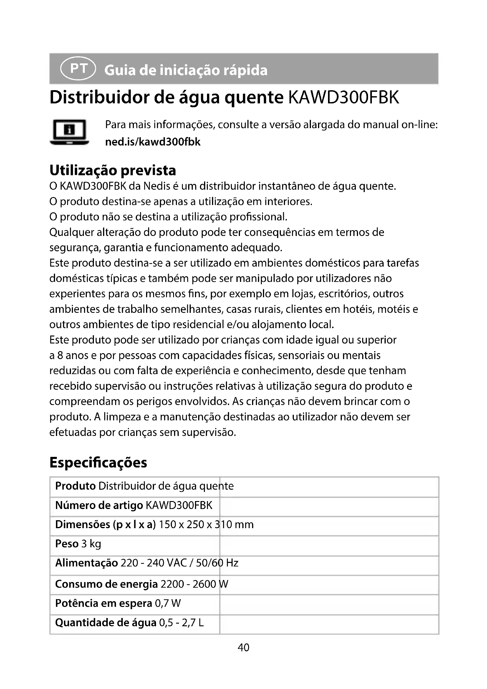 Guia de iniciação rápida Distribuidor de água quente KAWD300FBK Para mais informações, consulte a versão alargada do manual on-line: ned.is/kawd300fbk Utilização prevista O KAWD300FBK da Nedis é um distribuidor instantâneo de água quente. O produto destina-se apenas a utilização em interiores. O produto não se destina a utilização prossional. Qualquer alteração do produto pode ter consequências em termos de segurança, garantia e funcionamento adequado. Este produto destina-se a ser utilizado em ambientes domésticos para tarefas domésticas típicas e também pode ser manipulado por utilizadores não experientes para os mesmos ns, por exemplo em lojas, escritórios, outros ambientes de trabalho semelhantes, casas rurais, clientes em hotéis, motéis e outros ambientes de tipo residencial e/ou alojamento local. Este produto pode ser utilizado por crianças com idade igual ou superior a 8 anos e por pessoas com capacidades físicas, sensoriais ou mentais reduzidas ou com falta de experiência e conhecimento, desde que tenham recebido supervisão ou instruções relativas à utilização segura do produto e compreendam os perigos envolvidos. As crianças não devem brincar com o produto. A limpeza e a manutenção destinadas ao utilizador não devem ser efetuadas por crianças sem supervisão. Especicações Produto Distribuidor de água quente Número de artigo KAWD300FBK Dimensões (p x l x a) 150 x 250 x 310 mm Peso 3 kg Alimentação 220 - 240 VAC / 50/60 Hz Consumo de energia 2200 - 2600 W Potência em espera 0,7 W Quantidade de água 0,5 - 2,7 L KAWD300FBK_MAN_COMP_0520_print_(20160 1422)_v00.01.indd 40KAWD300FBK_MAN_COMP_0520_print_(20160 1422)_v00.01.indd 40 03-06-2020 08:2703-06-2020 08:2741 Peças principais (imagem A)