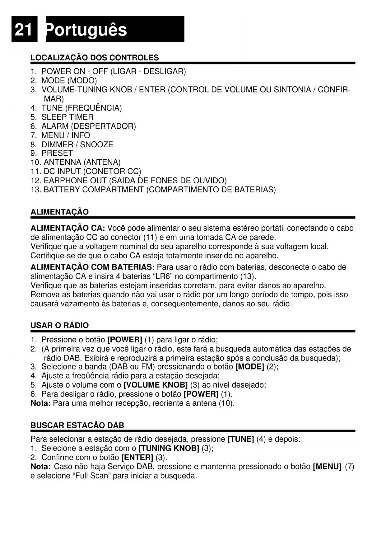 Nota: Caso não haja Serviço DAB, pressione e mantenha pressionado o botão [MENU] (7) e selecione “Full Scan” para iniciar a busqueda.22
