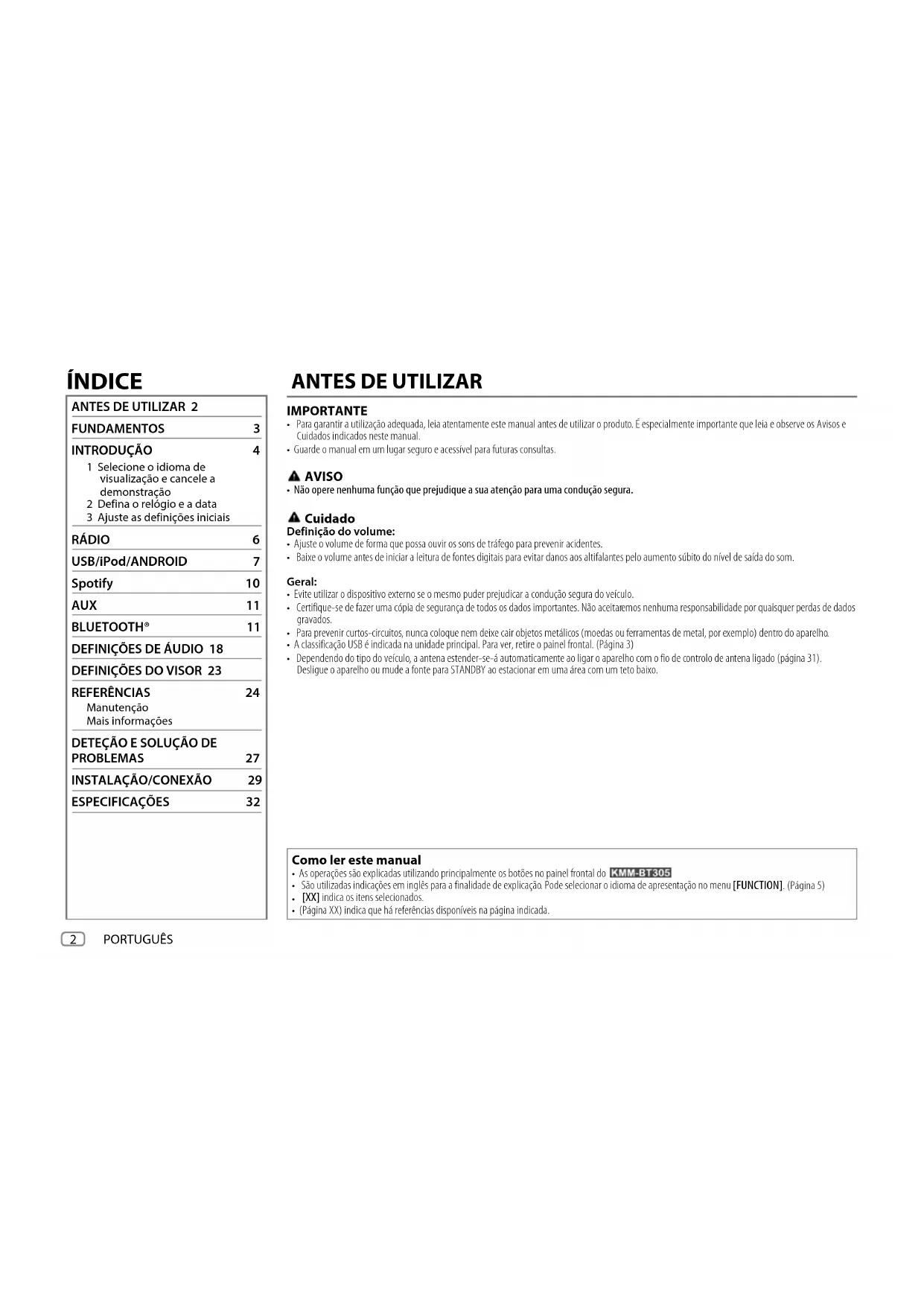 FUNDAMENTOS 3 INTRODUÇÃO 4 1 Selecione o idioma de visualização e cancele a demonstração 2 Defina o relógio e a data 3 Ajuste as definições iniciais RÁDIO 6 USB/iPod/ANDROID 7 Spotify 10 AUX 11 BLUETOOTH® 11