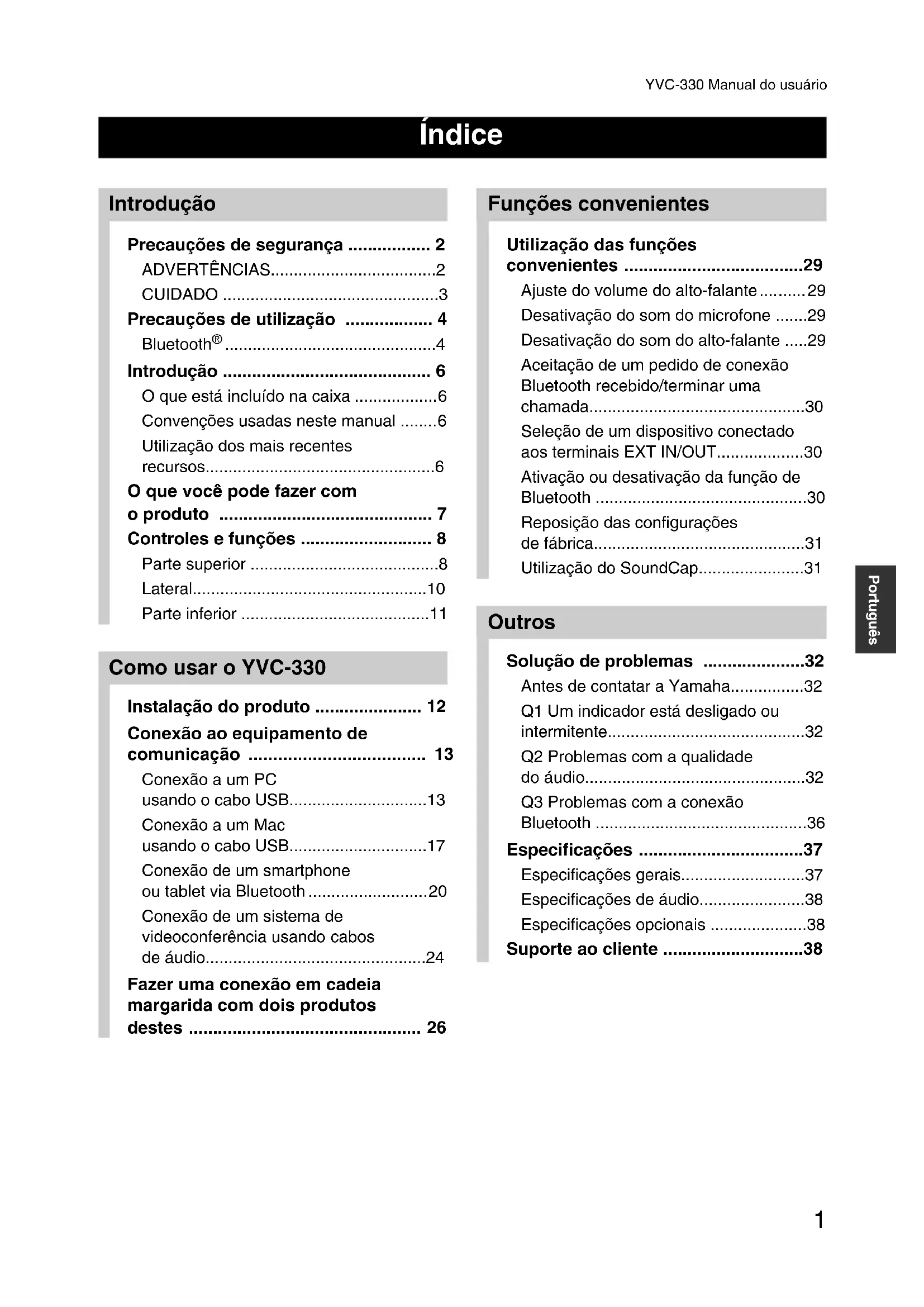 YVC-330 Manual do usuário Português Advertência: A operação deste equipamento em um ambiente residencial pode causar interferências de radioelétricas. Informações para os utilizadores relativas à recolha e eliminação de equipamentos usados Este símbolo, presente em produtos, embalagens e/ou incluído na documentação associada, indica que os produtos elétricos e eletrónicos usados não devem ser eliminados juntamente com os resíduos domésticos em geral. O procedimento correto consiste no tratamento, recuperação e reciclagem de produtos u sados, pelo que deve proceder à respetiva entrega nos pontos de recolha adequados, em conformidade com a legislação nacional em vigor. A eliminação destes produtos de forma adequada permite poupar recursos valiosos e evitar potenciais efeitos prejudiciais para a saúde pública e para o ambiente, associados ao processamento incorreto dos resíduos. Para mais informações relativas à recolha e reciclagem de produtos usados, contacte as autoridades locais, o serviço de eliminação de resíduos ou o ponto de venda onde foram adquiridos os itens relevantes. Informações para utilizadores empresariais na União Europeia: Para proceder à eliminação de equipamento elétrico e eletrónico, contacte o seu revendedor ou fornecedor para obter informações adicionais. Informações relativas à eliminação em países não pertencentes à União Europeia: Este símbolo é válido exclusivamente na União Europeia. Caso pretenda eliminar est e tipo de it ens, contacte as autoridades locais ou o seu revendedor e informe-se acerca do procedimento correto para proceder à respetiva eliminação.6 YVC-330 Manual do usuário Obrigado por comprar o Yamaha YVC-330. Este produto é um terminal de voz para realizar uma teleconferência e conversas remotas de forma conveniente, quando conectado a um equipamento de comunicação, tal como um PC ou Mac, um smartphone ou tablet e um sistema de videoconferência. Leia completamente este manual antes de usar o produto para efetuar a instalação e as conexões corretamente. Preserve este manual em um local seguro para não se perder.