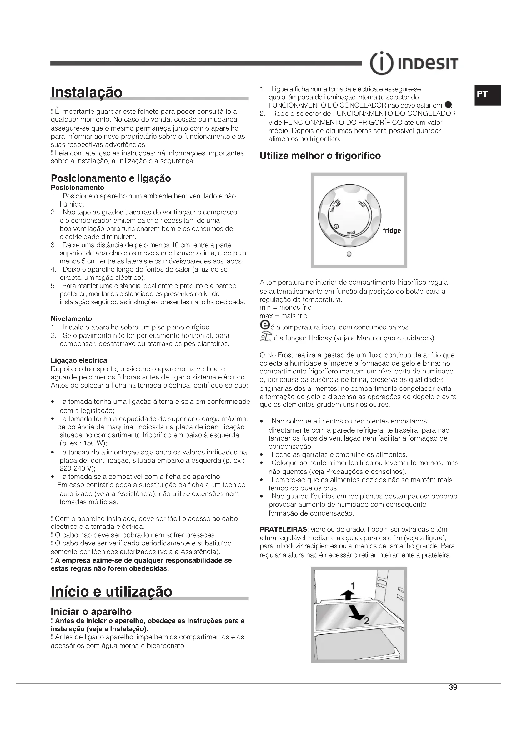 ydeFUNCIONAMENTODOFRIGORÍFICOatéumvalor médio.Depoisdealgumashorasserápossívelguardar alimentosnofrigorífico. Utilize melhor o frigorífico fridge Atemperaturanointeriordocompartimentofrigoríficoregula- seautomaticamenteemfunçãodaposiçãodobotãoparaa regulaçãodatemperatura. min =menosfrio max=maisfrio. éatemperaturaidealcomconsumosbaixos. éafunçãoHoliday(vejaaManutençãoecuidados). ONoFrostrealizaagestãodeumfluxocontínuodearfrioque colectaahumidadeeimpedeaformaçãodegeloebrina:no compartimentofrigoríferomantémumnívelcertodehumidade e,porcausadaausênciadebrina,preservaasqualidades origináriasdosalimentos;nocompartimentocongeladorevita aformaçãodegeloedispensaasoperaçõesdedegeloeevita queoselementosgrudemunsnosoutros.