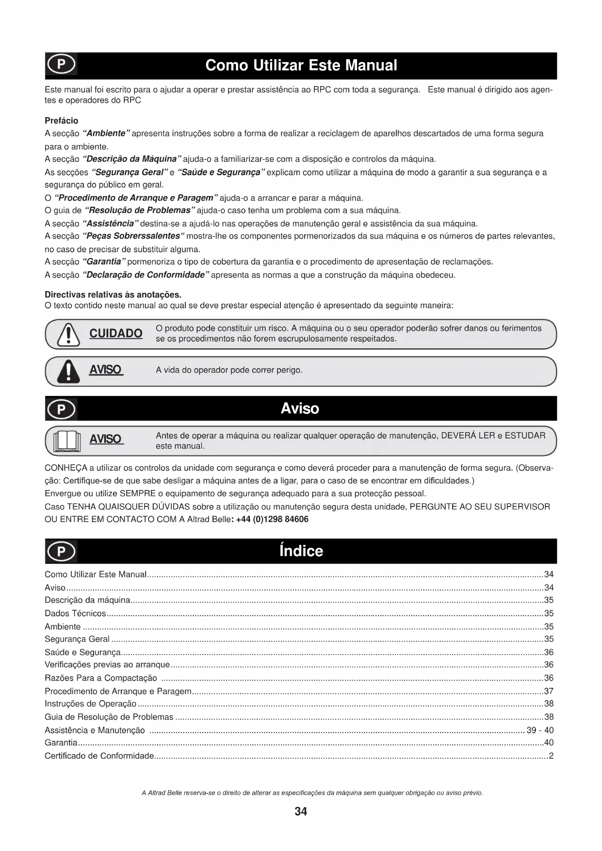 - desgaste normal. Los siguientes componentes no están amparados por la garantía. &RUUHDVGHWUDQVPLVLyQ )LOWURGHDLUHGHOPRWRU %XMtDGHOPRWRU Altrad Belle y/o sus agentes reconocidos, directores, empleados o aseguradores no se responsabilizan de ningún daño consecuencial u otros, pérdidas o gastos relacionados con o debidos a la inhabilidad de usar la máquina. Reclamaciones contra la garantía Todas las reclamaciones presentadas al amparo de la garantía deben dirigirse primero a Altrad Belle ya sea por teléfono, fax, correo electrónico o por escrito. Para las reclamaciones contra la garantía: 7HO )D[ Email : warranty@belle-group.co.uk Escriban a: Altrad Belle Warranty Department, Sheen, Nr. Buxton Derbyshire SK17 0EU England E34 Índice Aviso Como Utilizar Este Manual Este manual foi escrito para o ajudar a operar e prestar assistência ao RPC com toda a segurança. Este manual é dirigido aos agen- tes e operadores do RPC Prefácio A secção “Ambiente” apresenta instruções sobre a forma de realizar a reciclagem de aparelhos descartados de uma forma segura para o ambiente. A secção “Descrição da Máquina” ajuda-o a familiarizar-se com a disposição e controlos da máquina. As secções “Segurança Geral” e “Saúde e Segurança” explicam como utilizar a máquina de modo a garantir a sua segurança e a segurança do público em geral. O “Procedimento de Arranque e Paragem” ajuda-o a arrancar e parar a máquina. O guia de “Resolução de Problemas” ajuda-o caso tenha um problema com a sua máquina. A secção “Assistência” destina-se a ajudá-lo nas operações de manutenção geral e assistência da sua máquina. A secção “Peças Sobrerssalentes“ mostra-lhe os componentes pormenorizados da sua máquina e os números de partes relevantes, no caso de precisar de substituir alguma. A secção “Garantia” pormenoriza o tipo de cobertura da garantia e o procedimento de apresentação de reclamações. A secção “Declaração de Conformidade” apresenta as normas a que a construção da máquina obedeceu. Directivas relativas às anotações. O texto contido neste manual ao qual se deve prestar especial atenção é apresentado da seguinte maneira: CONHEÇA a utilizar os controlos da unidade com segurança e como deverá proceder para a manutenção de forma segura. (Observa- omR&HUWL¿TXHVHGHTXHVDEHGHVOLJDUDPiTXLQDDQWHVGHDOLJDUSDUDRFDVRGHVHHQFRQWUDUHPGL¿FXOGDGHV Envergue ou utilize SEMPRE o equipamento de segurança adequado para a sua protecção pessoal. Caso TENHA QUAISQUER DÚVIDAS sobre a utilização ou manutenção segura desta unidade, PERGUNTE AO SEU SUPERVISOR OU ENTRE EM CONTACTO COM A Altrad Belle: +44 (0)1298 84606 Antes de operar a máquina ou realizar qualquer operação de manutenção, DEVERÁ LER e ESTUDAR este manual. AVISO Como Utilizar Este Manual p. 34