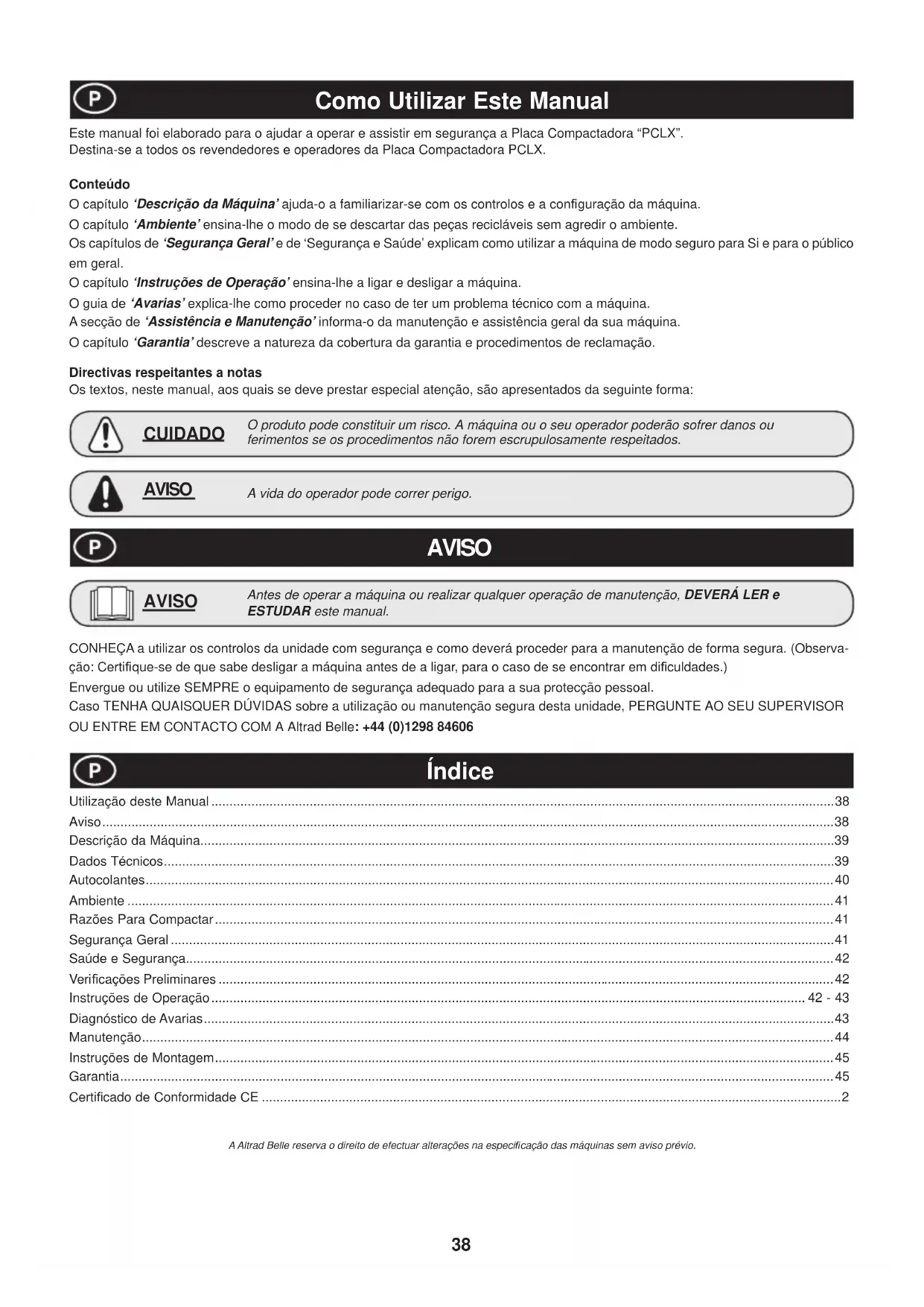 - Como Utilizar Este Manual A vida do operador pode correr perigo. AVISO O produto pode constituir um risco. A máquina ou o seu operador poderão sofrer danos ou ferimentos se os procedimentos não forem escrupulosamente respeitados. CUIDADO AVISO CONHEÇA a utilizar os controlos da unidade com segurança e como deverá proceder para a manutenção de forma segura. (Observa- ção: Certi¿ que-se de que sabe desligar a máquina antes de a ligar, para o caso de se encontrar em di¿ culdades.) Envergue ou utilize SEMPRE o equipamento de segurança adequado para a sua protecção pessoal. Caso TENHA QUAISQUER DÚVIDAS sobre a utilização ou manutenção segura desta unidade, PERGUNTE AO SEU SUPERVISOR OU ENTRE EM CONTACTO COM A Altrad Belle: +44 (0)1298 84606 Antes de operar a máquina ou realizar qualquer operação de manutenção, DEVERÁ LER e ESTUDAR este manual. AVISO Índice Este manual foi elaborado para o ajudar a operar e assistir em segurança a Placa Compactadora “PCLX”. Destina-se a todos os revendedores e operadores da Placa Compactadora PCLX. Conteúdo O capítulo ‘Descrição da Máquina’ ajuda-o a familiarizar-se com os controlos e a con¿ guração da máquina. O capítulo ‘Ambiente’ ensina-lhe o modo de se descartar das peças recicláveis sem agredir o ambiente. Os capítulos de ‘Segurança Geral’ e de ‘Segurança e Saúde’ explicam como utilizar a máquina de modo seguro para Si e para o público em geral. O capítulo ‘Instruções de Operação’ ensina-lhe a ligar e desligar a máquina. O guia de ‘Avarias’ explica-lhe como proceder no caso de ter um problema técnico com a máquina. A secção de ‘Assistência e Manutenção’ informa-o da manutenção e assistência geral da sua máquina. O capítulo ‘Garantia’ descreve a natureza da cobertura da garantia e procedimentos de reclamação. Directivas respeitantes a notas Os textos, neste manual, aos quais se deve prestar especial atenção, são apresentados da seguinte forma: Utilização deste Manual p. 38