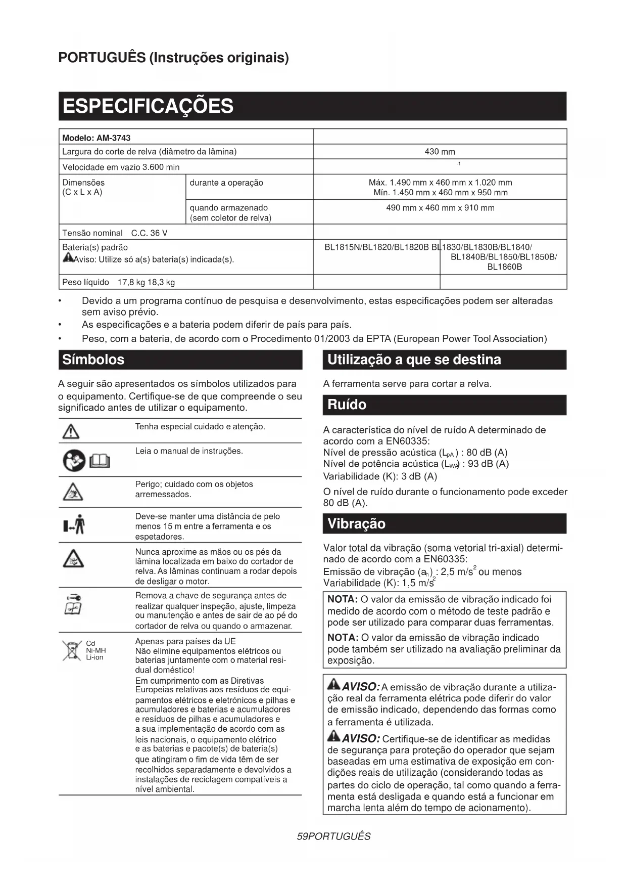 NOTA:Ovalordaemissãodevibraçãoindicadofoi medido de acordo com o método de teste padrão e podeserutilizadoparacompararduasferramentas. NOTA: O valor da emissão de vibração indicado pode também ser utilizado na avaliação preliminar da exposição. AVISO:Aemissãodevibraçãoduranteautiliza- çãorealdaferramentaelétricapodediferirdovalor deemissãoindicado,dependendodasformascomo aferramentaéutilizada. AVISO:Certique-sedeidenticarasmedidas desegurançaparaproteçãodooperadorquesejam baseadas em uma estimativa de exposição em con- dições reais de utilização (considerando todas as partesdociclodeoperação,talcomoquandoaferra- mentaestádesligadaequandoestáafuncionarem marcha lenta além do tempo de acionamento).60 PORTUGUÊS Declaração de conformidade CE Só para países Europeus AMakitadeclaraquea(s)seguinte(s)máquina(s): Designaçãodaferramenta:CortadoradeGramaa Bateria N.°/Tipodemodelo:AM-3743 Emconformidadecomasseguintesdiretivaseuro- peias:2000/14/EC,2006/42/EC Sãofabricadasdeacordocomasseguintesnormasou documentosnormalizados:EN60335 Ocheirotécnico,queestáemconformidadecoma 2006/42/CE,estádisponívelem: Makita, Jan-Baptist Vinkstraat 2, 3070, Bélgica Oprocedimentodeavaliaçãodaconformidadeneces- sárionoâmbitodadiretiva2000/14/CEfoiefetuadode acordo com o anexo VI. Organismonoticado:TÜVRheinlandLGAProducts GmbH AmGrauenStein29,51105Köln,Alemanha Númerodeidenticação0197 Nívelmedidodepotênciasonora:93dB(A) Nívelgarantidodepotênciasonora:94dB(A)