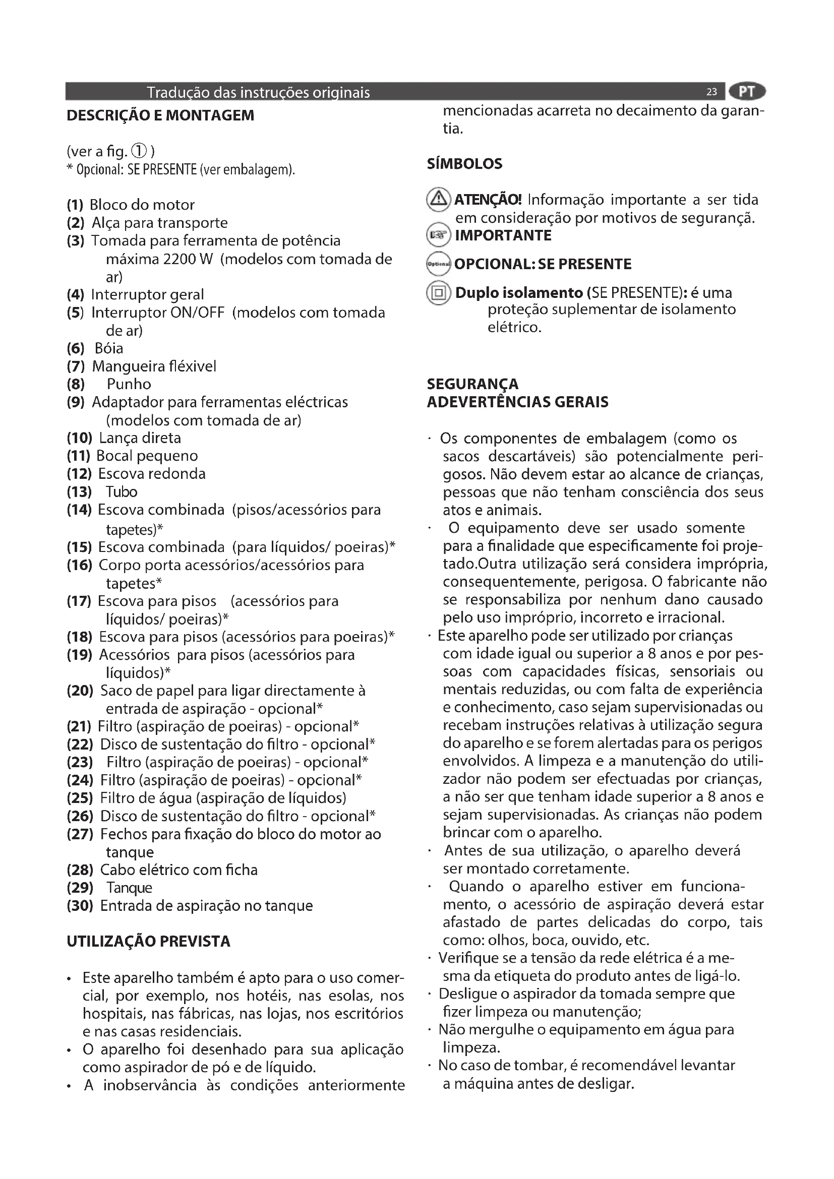 - Opcional: SE PRESENTE (ver embalagem). (1) Bloco do motor (2) Alça para transporte (3) Tomada para ferramenta de potência máxima 2200 W (modelos com tomada de ar) (4) Interruptor geral (5) Interruptor ON/OFF (modelos com tomada de ar) (6) Bóia (7) Mangueira éxivel (8) Punho (9) Adaptador para ferramentas eléctricas (modelos com tomada de ar) (10) Lança direta (11) Bocal pequeno (12) Escova redonda (13) Tubo (14) Escova combinada (pisos/acessórios para tapetes)* (15) Escova combinada (para líquidos/ poeiras)* (16) Corpo porta acessórios/acessórios para tapetes* (17) Escova para pisos (acessórios para líquidos/ poeiras)* (18) Escova para pisos (acessórios para poeiras)* (19) Acessórios para pisos (acessórios para líquidos)* (20) Saco de papel para ligar directamente à entrada de aspiração - opcional* (21) Filtro (aspiração de poeiras) - opcional* (22) Disco de sustentação do ltro - opcional* (23) Filtro (aspiração de poeiras) - opcional* (24) Filtro (aspiração de poeiras) - opcional* (25) Filtro de água (aspiração de líquidos) (26) Disco de sustentação do ltro - opcional* (27) Fechos para xação do bloco do motor ao tanque (28) Cabo elétrico com cha (29) Tanque (30) Entrada de aspiração no tanque