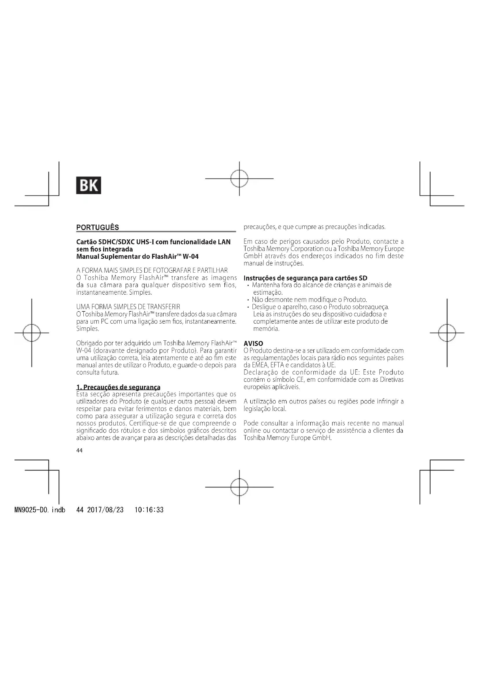 O representante autorizado da Toshiba Memory Corporation responsável pela Declaração de conformidade da UE e pela aposição da Marcação CE é a Toshiba Memory Europe GmbH, Hansaallee 181, 40549 Düsseldorf, Alemanha. Aviso regulamentar da União Europeia Na qualidade de Fabricante, a Toshiba Memory Corporation, 1-1-1, Shibaura, Minato-ku, Tokyo, Japão declara pelo presente documento que o WLSDTHNSWCAE está em conformidade com a Diretiva 2014/53/UE. A Declaração de conformidade da UE completa e ocial pode ser encontrada no web site da Toshiba Memory Europe GmbH. https://apps.toshiba.de/ce_docs/ Informações sobre o produto Amplitude de frequência: 2412 - 2462MHz Potência máx. radiada: 17dBm Eliminação de produtos O símbolo constituído por um contentor de lixo com rodas barrado com uma cruz indica que os produtos têm de ser recolhidos e eliminados em separado do lixo doméstico. As pilhas e os acumuladores integrados podem ser eliminados com o produto. Estes serão separados nos centros de reciclagem. A barra preta indica que o produto foi colocado no mercado depois de 13 de agosto de 2005. Ao participar na recolha separada de produtos e pilhas/ baterias, irá ajudar a garantir a eliminação adequada de produtos e pilhas/baterias e, deste modo, a ajudar a evitar potenciais consequências negativas para o ambiente e para a saúde humana. Para obter informações mais detalhadas sobre programas de recolha e reciclagem disponíveis no seu país, visite o nosso web site www.ToshibaMemoryCorp.com, ou contacte o centro de recolha do seu município ou a loja onde adquiriu o produto. MN9025-D0.indb 46 2017/08/23 10:16:3447 REACH – Declaração de conformidade O regulamento relativo a produtos químicos da União Europeia (UE), REACH (Registration, Evaluation, Authorization and Restriction of Chemicals – Registo, avaliação, autorização e restrição de substâncias químicas), entrou em vigor em 1 de junho de 2007, com prazos de implementação faseados até 2018. A Toshiba Memory irá cumprir todos os requisitos REACH e compromete-se a disponibilizar aos nossos clientes informações sobre a presença nos nossos artigos de substâncias que estejam incluídas na lista de substâncias candidatas, de acordo com o regulamento REACH. Consulte o seguinte web site www.ToshibaMemoryCorp.com para obter informações sobre a presença nos nossos artigos de substâncias que estejam incluídas na lista de substâncias candidatas, de acordo com o regulamento REACH, numa combinação superior a 0,1%, peso por peso. Fabricante: TOSHIBA MEMORY CORPORATION, 1-1-1, Shibaura, Minato-ku, Tóquio, Japão Importador: Toshiba Memory Europe GmbH, Hansaallee 181, 40549 Düsseldorf, Alemanha Registo comercial: Düsseldorf HRB 22487 Notas de rodapé O logótipo SDHC e o logótipo SDXC são marcas comerciais da SD-3C LLC. Android e Google Play são marcas comerciais da Google Inc. Mac, App Store, iPhone e iPad são marcas comerciais da Apple Inc. WPA2 é uma marca comercial da Wi-Fi Alliance. FlashAir é uma marca comercial da Toshiba Memory Corporation. Todos os outros nomes de empresas, nomes de produtos e nomes de serviços podem ser marcas comerciais das respetivas empresas. Fabricado no Japão. © Copyright 2017 TOSHIBA MEMORY CORPORATION. Todos os direitos reservados.