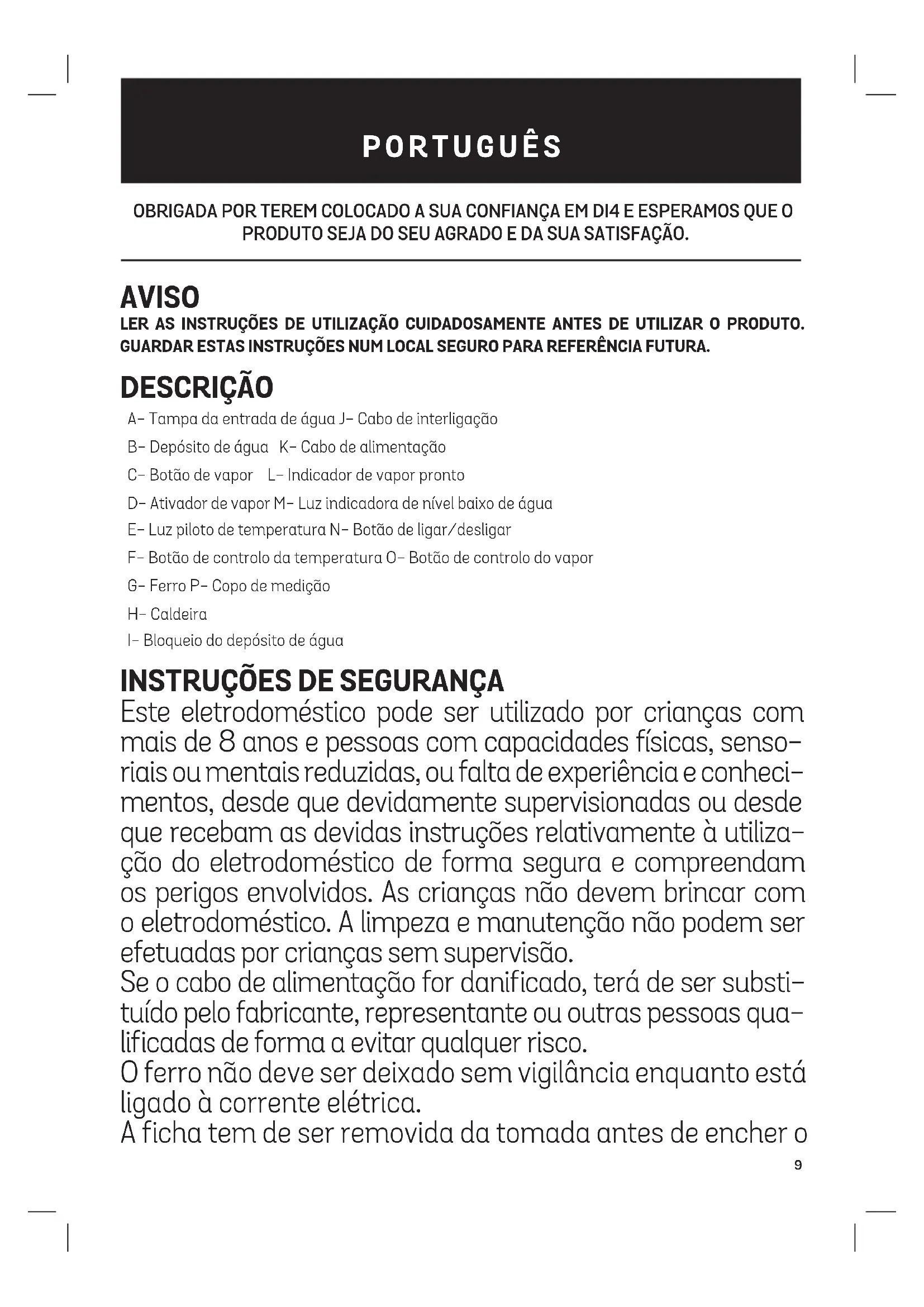 Este eletrodoméstico pode ser utilizado por crianças com mais de 8 anos e pessoas com capacidades físicas, senso- riais ou mentais reduzidas, ou falta de experiência e conheci- mentos, desde que devidamente supervisionadas ou desde que recebam as devidas instruções relativamente à utiliza- ção do eletrodoméstico de forma segura e compreendam os perigos envolvidos. As crianças não devem brincar com o eletrodoméstico. A limpeza e manutenção não podem ser efetuadas por crianças sem supervisão. Se o cabo de alimentação for danificado, terá de ser substi- tuído pelo fabricante, representante ou outras pessoas qua- lificadas de forma a evitar qualquer risco. O ferro não deve ser deixado sem vigilância enquanto está ligado à corrente elétrica. A ficha tem de ser removida da tomada antes de encher o10 depósito com água. O ferro tem de ser utilizado e pousado sobre uma superfí- cie plana e estável. Ao pousar o ferro sobre a respetiva base, certifique-se de que a superfície sobre a qual a base está colocada é estável. O ferro não poderá voltar a ser utilizado se tiver sofrido uma queda, se apresentar sinais visíveis de danos ou se possuir fugas. Manter o ferro e o respetivo cabo fora do alcance de crian- ças menores de 8 anos quando estiver ligado à corrente ou a arrefecer. A tampa de autolimpeza não pode ser aberta durante a uti- lização. Instruções para o reenchimento seguro do depósito de água na secção sobre o enchimento do depósito de água. CUIDADO Superfícies quentes. É provável que as su- perfícies aqueçam durante a utilização. AVISOS IMPORTANTES Este aparelho foi concebido para utilização doméstica e nunca deverá ser utilizado para fins comer- ciais ou industriais, sejam quais forem as circunstâncias. Qualquer utilização incorreta ou manusea- mento indevido do produto anulará a garantia. Antes de ligar o produto, verificar se a tensão elétrica é idêntica à indicada na etiqueta do produto. Se utilizar um transformador, certifique-se de que alcança os 16 A e que possui ligação à terra. O cabo de alimentação não pode ficar emaranhado ou enrolado em redor do produto durante a utilização. Não utilizar o dispositivo, nem ligar ou desligar da corrente elétrica com as mãos e/ou os pés molhados. Não puxar o cabo de alimentação de forma a desligá-lo nem utilizá-lo como pega. Não direcionar o vapor para pessoas ou animais. Não colocar o eletrodoméstico sob a torneira para encher o depósito de água, nem mergulhá-lo em água ou outros líquidos. Desligar imediatamente o produto da tomada elétrica em caso de falha ou danos e contactar um serviço de suporte técnico oficial. De forma a evitar riscos, não abrir o dispositivo. Apenas pessoal técnico qualificado do serviço de suporte técnico oficial da marca poderá levar a cabo reparações ou procedimentos no dispositivo. Apenas o centro de serviço de suporte técnico oficial poderá levar a cabo reparações neste produto. Proceder de acordo com a secção de conservação e limpeza deste manual para limpar. A B&B TRENDS SL. renuncia a qualquer responsabilidade por danos que possam ocorrer em pes- soas, animais ou objetos, devido a incumprimento destes avisos.11