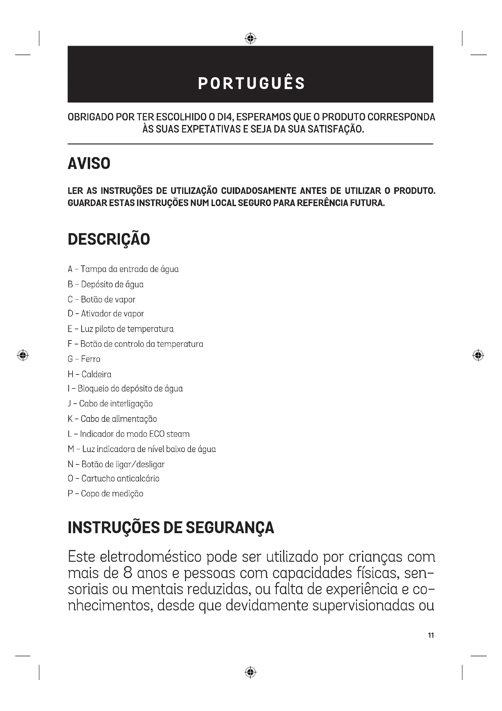 Este produto está em conformidade com a Diretiva Europeia 2012/19/EU quanto a dispo- sitivos elétricos e eletrónicos, conhecida como REEE (Resíduos de Equipamentos Elétricos e Eletrónicos), que disponibiliza o enquadramento legal dentro da União Europeia para a eliminação e reutilização de resíduos eletrónicos e elétricos. Não eliminar este produto no caixote do lixo. Dirigir-se antes ao centro de recolha de resíduos elétricos e eletrónicos da área de residência.18 WE WOULD LIKE TO THANKS YOU FOR CHOOSING DI4, WE WISH THE PRODUCT PERFORMS TO YOUR SATISFACTION AND PLEASURE. WARNING PLEASE READ THE INSTRUCTIONS FOR USE CAREFULLY PRIOR TO USING THE PRODUCT. STORE THESE IN A SAFE PLACE FOR FUTURE REFERENCE. DESCRIPTION A -Water Inlet Cover B - Water Tank C - Steam Button D - Steam Trigger E - Temperature pilot lamp F - Temperature Control Dial G - Iron H - Station I - Water Tank Locker J - Interconnection Cord K - Power Cord L - ECO steam mode indicator M - Lower Water Indicator Light N - Switch Button O - Anti-calc cartridge P - Measure cup