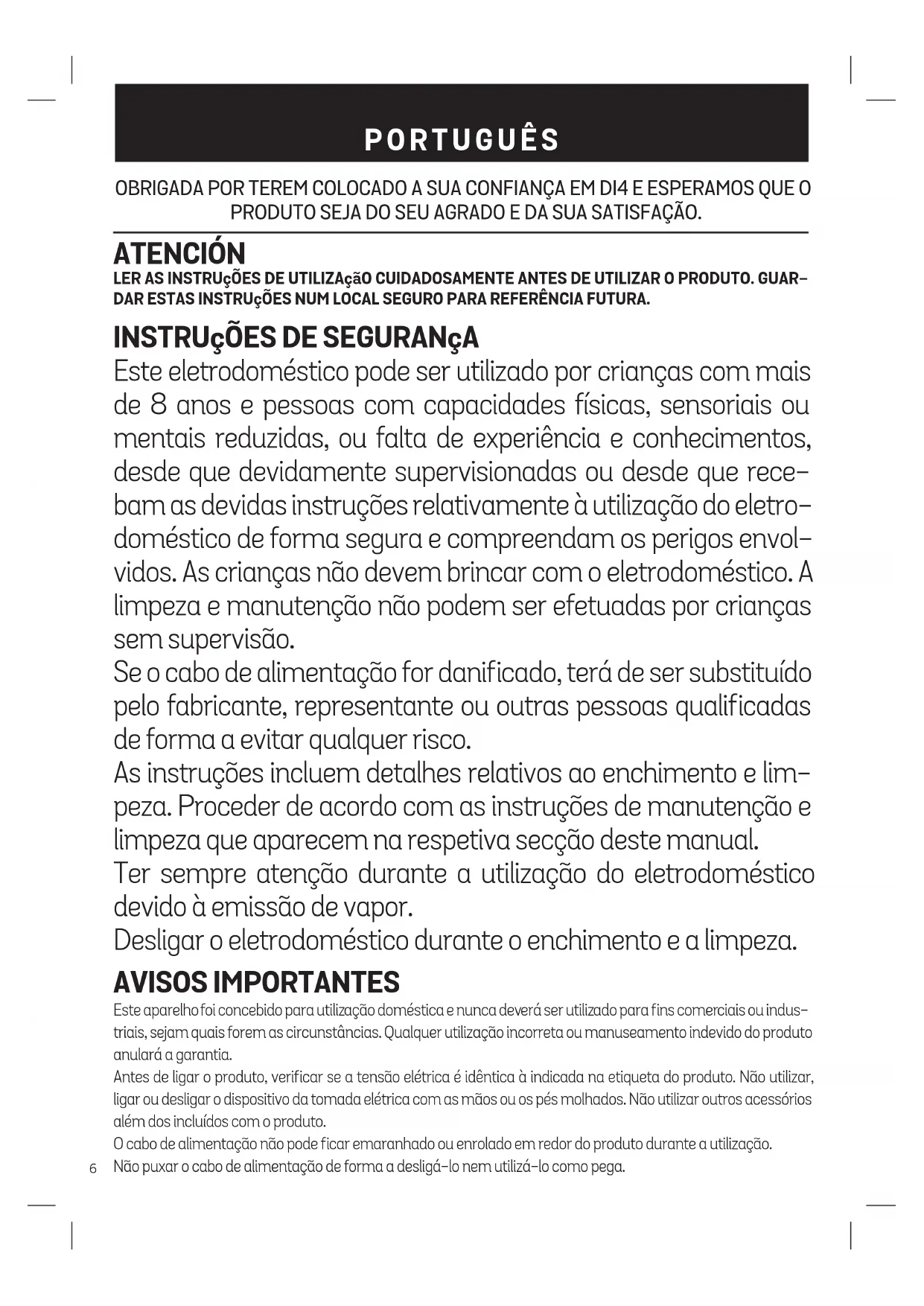 La unidad no funciona Algo falla en la fuente de alimentación El enchufe no está bien conectado en el zócalo El fusible térmico está fundido La luz indicadora no está encendida Pida a un técnico cualificado que lo revise y arregle Se escucha un ruido fuerte en la manguera de vapor cuando la cantidad del vapor es baja La tapa del vapor está demasiado baja Levante la tapa del vapor a una posición más elevada y deje que el agua vuelva a la caldera Cae agua de la tapa del vapor La tapa del vapor está dañada La tapa del vapor está demasiado baja Sustituya la tapa del vapor por una nueva. Levante la tapa del vapor a una posición más elevada Hay una fuga de agua en la posición de conexión de la manguera de vapor y la unidad principal El caucho sellado se ha endurecido Hay poca conexión de la manguera de vapor Reemplace el caucho sellado por uno nuevo. Asegúrese de que la manguera de vapor esté bien cargada Hay una fuga de agua en el depósito de agua El depósito de agua está dañado Sustituya el depósito de agua por uno nuevo El agua se calienta en el depósito de agua Se ha bloqueado la manguera de vapor Desbloquear La cantidad de vapor es baja El voltaje no es el apropiado Se ha bloqueado la manguera de vapor Adoptar un adaptador de corriente Desbloquear El depósito de agua está deformado Se ha llenado con agua caliente Utilizó los productos químicos de forma incorrecta Reemplácelo por uno nuevo Utilice los productos químicos de forma correcta No hay salida de vapor aunque la luz indicadora esté encendida La caldera no funciona Hay componentes internos dañados Pida a un técnico cualificado que lo revise y arregle Este producto cumple con la Directiva Europea 2012/19/UE sobre dispositivos eléctricos y electró- nicos, conocida como RAEE (Residuos de equipos eléctricos y electrónicos), que establece el marco legal aplicable en la Unión Europea para la eliminación y el reciclaje de dispositivos electrónicos y eléctricos. No lance este producto a la basura. Llévelo al centro de tratamiento de residuos eléctri- cos y electrónicos más cercano.6 PoRtUGUÊS OBRIGADA POR TEREM COLOCADO A SUA CONFIANÇA EM DI4 E ESPERAMOS QUE O PRODUTO SEJA DO SEU AGRADO E DA SUA SATISFAÇÃO. AtENCIÓN LER AS INStRUçÕES DE UtILIzAção CUIDADoSAMENtE ANtES DE UtILIzAR o PRoDUto. GUAR- DAR EStAS INStRUçÕES NUM LoCAL SEGURo PARA REFERÊNCIA FUtURA. INStRUçÕES DE SEGURANçA Este eletrodoméstico pode ser utilizado por crianças com mais de 8 anos e pessoas com capacidades físicas, sensoriais ou mentais reduzidas, ou falta de experiência e conhecimentos, desde que devidamente supervisionadas ou desde que rece- bam as devidas instruções relativamente à utilização do eletro- doméstico de forma segura e compreendam os perigos envol- vidos. As crianças não devem brincar com o eletrodoméstico. A limpeza e manutenção não podem ser efetuadas por crianças sem supervisão. Se o cabo de alimentação for danificado, terá de ser substituído pelo fabricante, representante ou outras pessoas qualificadas de forma a evitar qualquer risco. As instruções incluem detalhes relativos ao enchimento e lim- peza. Proceder de acordo com as instruções de manutenção e limpeza que aparecem na respetiva secção deste manual. Ter sempre atenção durante a utilização do eletrodoméstico devido à emissão de vapor. Desligar o eletrodoméstico durante o enchimento e a limpeza. AVISoS IMPoRtANtES Este aparelho foi concebido para utilização doméstica e nunca deverá ser utilizado para fins comerciais ou indus- triais, sejam quais forem as circunstâncias. Qualquer utilização incorreta ou manuseamento indevido do produto anulará a garantia. Antes de ligar o produto, verificar se a tensão elétrica é idêntica à indicada na etiqueta do produto. Não utilizar, ligar ou desligar o dispositivo da tomada elétrica com as mãos ou os pés molhados. Não utilizar outros acessórios além dos incluídos com o produto. O cabo de alimentação não pode ficar emaranhado ou enrolado em redor do produto durante a utilização. Não puxar o cabo de alimentação de forma a desligá-lo nem utilizá-lo como pega.7 Não direcionar o vapor para pessoas ou animais. Não colocar o eletrodoméstico sob a torneira para encher o depósito de água, nem mergulhá-lo em água ou outros líquidos. Desligar imediatamente o produto da tomada elétrica em caso de falha ou danos e contactar um serviço de suporte técnico oficial. De forma a evitar riscos, não abrir o dispositivo. Apenas pessoal técnico qualificado do serviço de suporte técnico oficial da marca poderá levar a cabo reparações ou procedimentos no dispositivo. Apenas o centro de serviço de suporte técnico oficial poderá levar a cabo reparações neste produto. A B&B tRENDS SL. renuncia a qualquer responsabilidade por danos que possam ocorrer em pessoas, ani- mais ou objetos, devido a incumprimento destes avisos. ANtES DA PRIMEIRA UtILIzAção Na primeira utilização, poderá emitir odores ou vapores que desaparecerão rapidamente. Não pulverizar na primeira utilização sobre vestuário, pois poderá existir vestígios de sujidade na cabeça de vapor. Remover a ficha da tomada elétrica antes de encher (ou esvaziar) o vaporizador Introduzir o tubo de alumínio telescópico nos suportes, abrir em seguida o bloqueio do tubo de alumínio e pro- longar o tubo telescópico, fechando em seguida o bloqueio do tubo de alumínio para o fixar. Introduzir o cabide na parte superior. Instalar o acessório de vapor e fixá-lo premindo o botão; rodar para a esquerda para a posição de bloqueio. Retirar o depósito de água e desenroscar o tampão de enchimento. Encher o depósito de água até ao topo e enroscar o tampão de enchimento. O seu eletrodoméstico foi concebido para operar com água da torneira não tratada; repor o depósito de água na devida posição no eletrodoméstico e ligá-lo. Não utilizar água pura desmineralizad