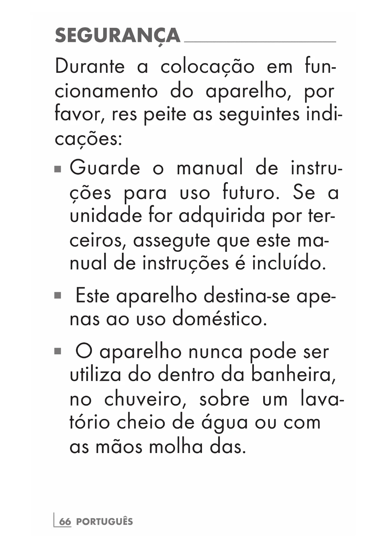 O aparelho nunca pode ser utiliza do dentro da banheira, no chuveiro, sobre um lava- tório cheio de água ou com as mãos molha das.67 PORTUGUÊS