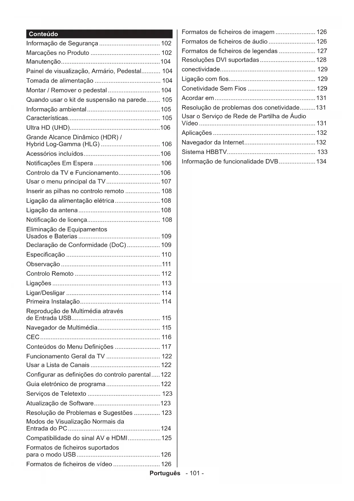 - HbbTV Ultra HD (UHD) A TV suporta Ultra HD (Ultra Alta Definição - também conhecida como 4K) que fornece resolução de 3840 x 2160 (4K:2K). Iguala 4 vezes a resolução de TV Full HD duplicando a contagem de pixeis da TV Full HD tanto na horizontal como na vertical. Os conteúdos HD são suportador pelas entradas HDMI USB e nas transmissões DVB-T2 e DVB-S2. Grande Alcance Dinâmico (HDR) / Hybrid Log- Gamma (HLG) Usando esta função a TV pode reproduzir maior alcance dinâmico de luminosidade, captando e combinando várias exposições diferentes. HDR/HLG oferece uma melhor qualidade de imagem graças a reflexos mais brilhantes, mais realistas, cores mais realistas e outras melhorias. Proporciona a aparência que os cineastas pretendem alcançar, mostrando as áreas ocultas de sombras escuras e luz solar com total clareza, cor e detalhe. Os conteúdos HDR/ HLG são suportados através de aplicações nativas e do portal, pelas entradas HDMI e USB e através de transmissões DVB-S Definir a entrada da fonte HDMI relacionada como Melhorada a partir da opção Fontes no menu Definições>Sistema para visualizar as imagens HDR/HLG, se o conteúdo HDR/HLG for recebido através de uma entrada HDMI Neste caso o dispositivo da fonte também deve ser compatível com HDMI 2.0a no mínimo Acessórios incluídos