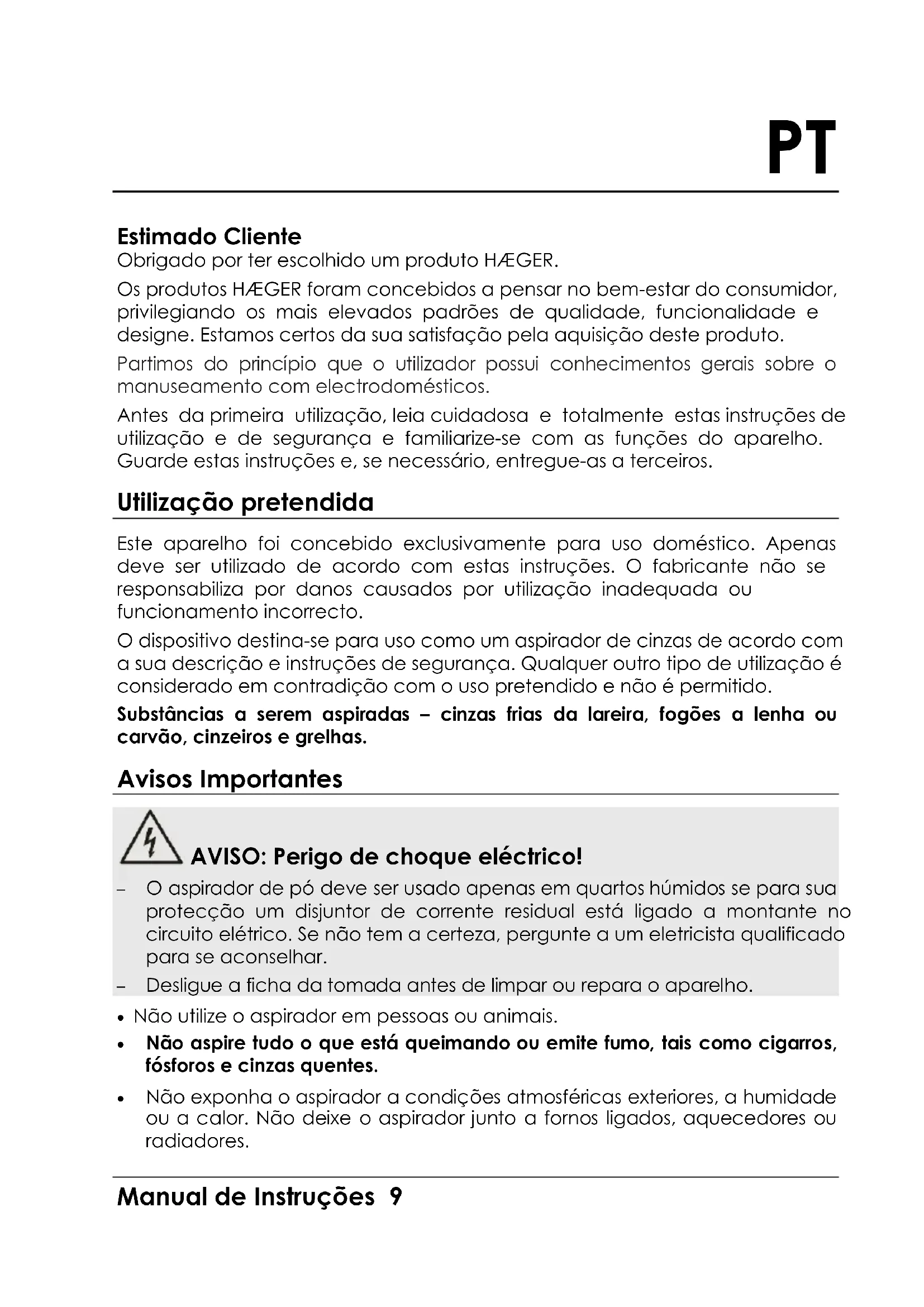 Conformity This product has been tested and produced according to all relevant current CE guidelines, such as: - electromagnetic compatibility Directive 2014/30/EU, - Low voltage Directive (LVD) Directive 2014/35/EU, - RoHS Directive 2011/65/EU and has been constructed in accordance with the latest safety regulations. The electrical safety of the appliance can only be guaranteed if the product is connected to an approved earth connection. Disposal – Environment policy Packing The packaging material is entirely recyclable, and marked with the recycling symbol. Follow local regulations for scrapping. Keep the packaging materials (plastic bags, polystyrene parts, etc.) out of reach of children, as they are potentially dangerous. Disposal The appliance is manufactured using recyclable material. This appliance is marked according to the European directive 2012/19/EU on Waste Electrical and Electronic Equipment (WEEE). By ensuring this product is disposed of correctly, you will help prevent potential negative consequences for the environment and human health, which could otherwise be caused by inappropriate waste handling of this product.English 8 Instructions for use This symbol on the product, or on the documents accompanying the product, indicates that this appliance may not be treated as household waste. Instead it shall be handed over to the applicable collection point for the recycling of electrical and electronic equipment. Before disposal, make the appliance unusable by cutting off the power cable and removing the doors and shelves so that children cannot easily climb inside the appliance. Disposal must be carried out in accordance with local environmental regulations for waste disposal. Deliver the appliance immediately to an authorized dump; do not leave it unattended even for a few days, since it is potentially dangerous for children. For more detailed information about treatment, recovery and recycling of this product, please contact your local city office, your household waste disposal service or the shop where you purchased the product. Guarantee This unit is covered by a 24 months (*) warranty, from the purchase date, and covers the repair free of charges of the damaged due to the manufacturer fault or defected components. The distributor reserves the right to change the unit for an equivalent model. The warranty does not cover any damaged caused by incorrect use, lightning, incorrect installation, external factors or any intentional damaged. The warranty does not cover damage thus attributable to falls, blows, spill, exposure to extreme environmental conditions or deterioration caused by normal use of plastic parts or keyboards, as well as by the use of batteries other than those specified in this manual. For the repairing, during the warranty period, the unit shall be sent to the distributor or reseller, or to the address indicated by them, and must be jointed the warranty certificated and the respective original invoice or selling ticket, where the buying date is expressed indicated. The consumer is protected by the guarantee provided by Directive 1999/44/CE of European Parliament and Council of 25 May. (*) Only for European Union countriesPT Manual de Instruções 9 Estimado Cliente Obrigado por ter escolhido um produto HÆGER. Os produtos HÆGER foram concebidos a pensar no bem-estar do consumidor, privilegiando os mais elevados padrões de qualidade, funcionalidade e designe. Estamos certos da sua satisfação pela aquisição deste produto. Partimos do princípio que o utilizador possui conhecimentos gerais sobre o manuseamento com electrodomésticos. Antes da primeira utilização, leia cuidadosa e totalmente estas instruções de utilização e de segurança e familiarize-se com as funções do aparelho. Guarde estas instruções e, se necessário, entregue-as a terceiros. Utilização pretendida Este aparelho foi concebido exclusivamente para uso doméstico. Apenas deve ser utilizado de acordo com estas instruções. O fabricante não se responsabiliza por danos causados por utilização inadequada ou funcionamento incorrecto. O dispositivo destina-se para uso como um aspirador de cinzas de acordo com a sua descrição e instruções de segurança. Qualquer outro tipo de utilização é considerado em contradição com o uso pretendido e não é permitido. Substâncias a serem aspiradas – cinzas frias da lareira, fogões a lenha ou carvão, cinzeiros e grelhas. Avisos Importantes AVISO: Perigo de choque eléctrico! – O aspirador de pó deve ser usado apenas em quartos húmidos se para sua protecção um disjuntor de corrente residual está ligado a montante no circuito elétrico. Se não tem a certeza, pergunte a um eletricista qualificado para se aconselhar. – Desligue a ficha da tomada antes de limpar ou repara o aparelho. Não utilize o aspirador em pessoas ou animais. Não aspire tudo o que está queimando ou emite fumo, tais como cigarros, fósforos e cinzas quentes. Não exponha o aspirador a condições atmosféricas exteriores, a humidade ou a calor. Não deixe o aspirador junto a fornos ligados, aquecedores ou radiadores.Português 10 Manual de Instruções Antes de ligar o aparelho à tomada certifique-se que a voltagem corresponde à indicada da placa de especificações. Não coloque o aspirador a funcionar com o cabo ainda enrolado. Não desligue o aparelho puxando a ficha. Desligue o aspirador da tomada quando não o estiver a utilizar e antes de o limpar ou de mudar os filtros. Não pegue no aspirador ao contrário nem o guarde na posição vertical sobre a parte de trás quando há água no depósito. Não pegue no aspirador ou na ficha com as mãos molhadas. Não imerja o aparelho na água. Não desloque o aspirador puxando-o pelo cabo ou pelo tubo de aspiração. Utilize a asa de transporte. Não utilize o aspirador se o cabo ou a ficha estiverem danificados ou se observa que não funciona correctamente. Quando fechar uma porta, assegure-se de
