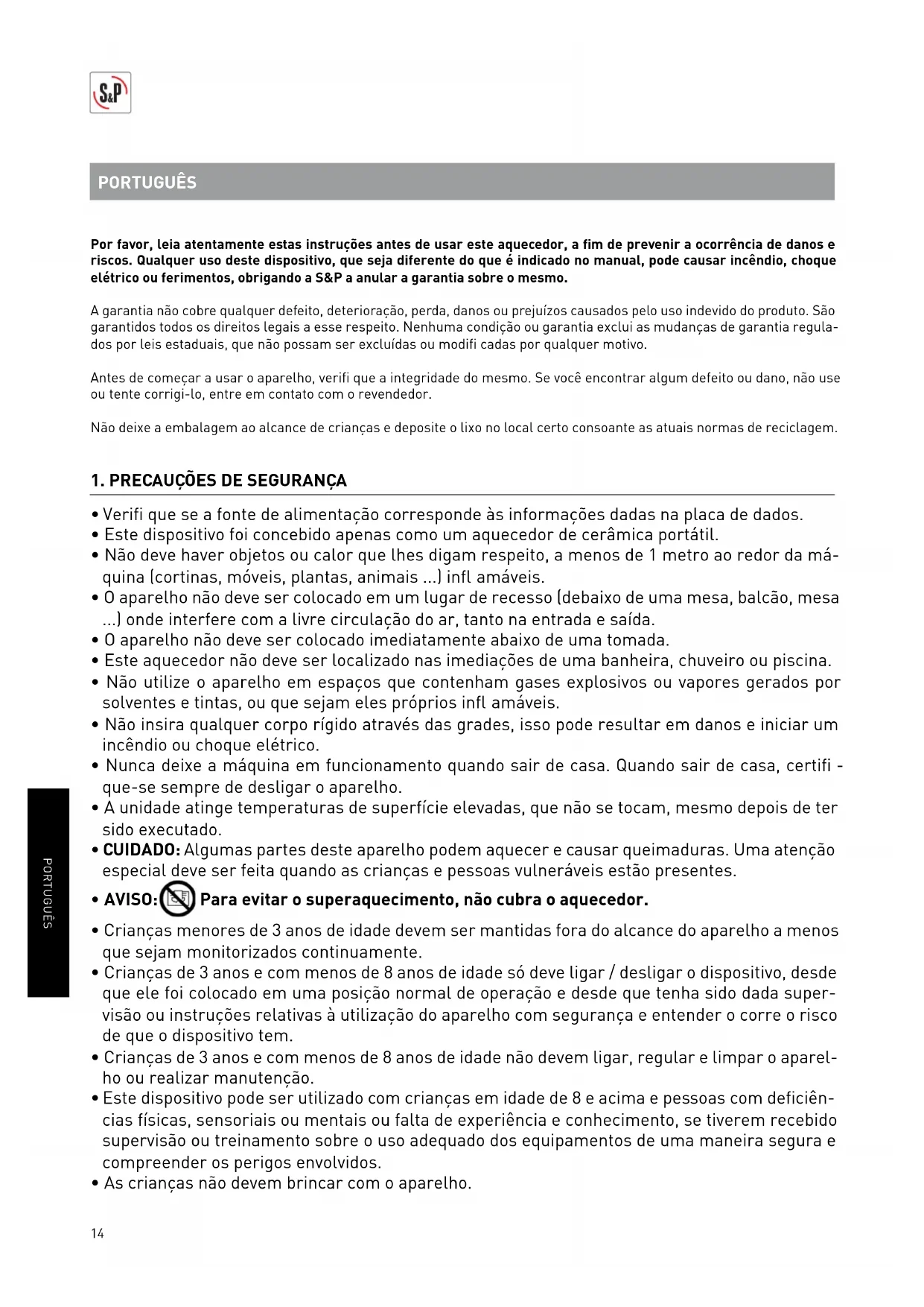 - Pour toute précision ou pour répondre à toutes questions concernant les produits S&P adresser-vous à votre distributeur habituel. Vous trouverez son adresse sur notre site www.solerpalau.com LE FABRICANT NE POURRA ETRE TENU POUR RESPONSABLE DES DOMMAGES OCCASIONNÉS AUX PERSONNES ET/OU AUX CHOSES, DUS AU NON RESPECT DE CES RECOMMANDATIONS. S&P SE RESERVE LE DROIT DE MODIFIER LE PRODUIT SANS PREAVIS.14 PORTUGUÊS Por favor, leia atentamente estas instruções antes de usar este aquecedor, a fi m de prevenir a ocorrência de danos e riscos. Qualquer uso deste dispositivo, que seja diferente do que é indicado no manual, pode causar incêndio, choque elétrico ou ferimentos, obrigando a S&P a anular a garantia sobre o mesmo. A garantia não cobre qualquer defeito, deterioração, perda, danos ou prejuízos causados pelo uso indevido do produto. São garantidos todos os direitos legais a esse respeito. Nenhuma condição ou garantia exclui as mudanças de garantia regula- dos por leis estaduais, que não possam ser excluídas ou modifi cadas por qualquer motivo. Antes de começar a usar o aparelho, verifi que a integridade do mesmo. Se você encontrar algum defeito ou dano, não use ou tente corrigi-lo, entre em contato com o revendedor. Não deixe a embalagem ao alcance de crianças e deposite o lixo no local certo consoante as atuais normas de reciclagem.