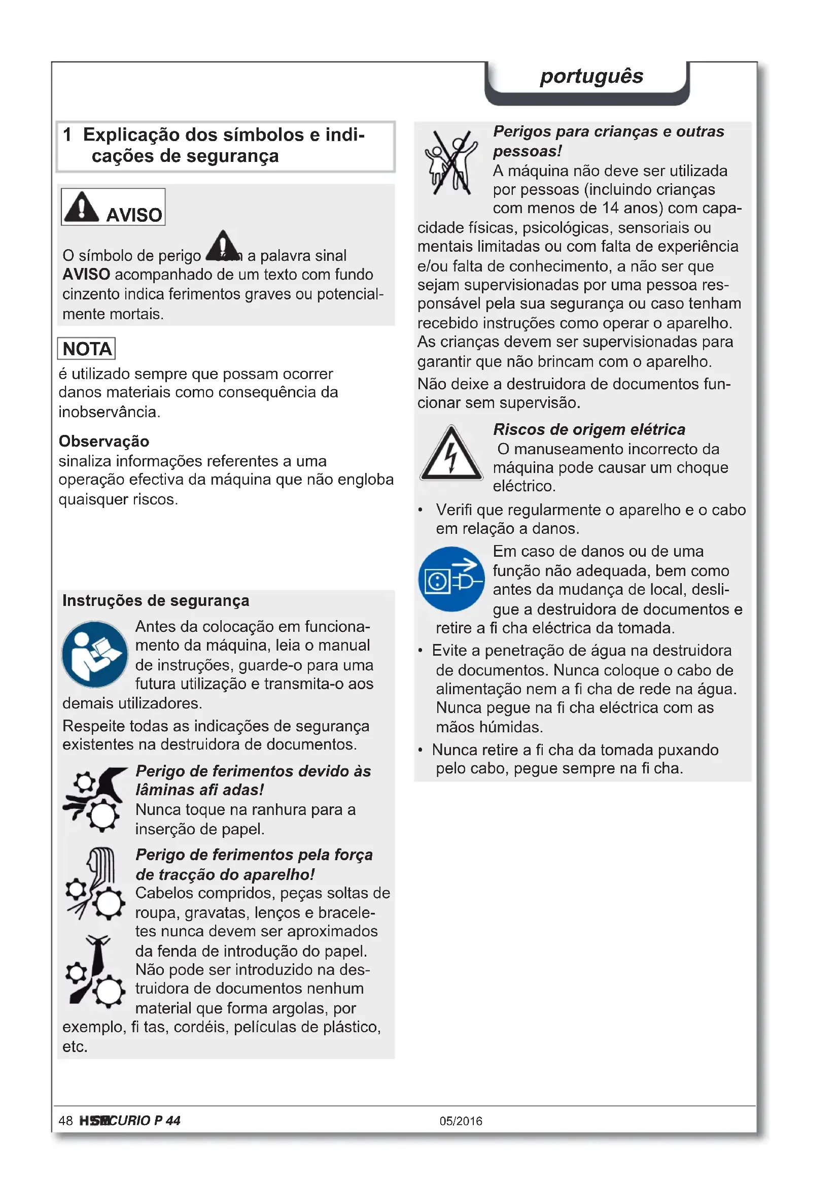 - Número máx. de hojas (DIN A4, 70 g/m² u 80 g/m²), introducidas longitudinalmente, que se cortan de una pasada. Los datos de potencia indicados han sido calculados con el motor en frío y el mecanismo de corte recién lubricado. Una tensión de red menor u otras frecuencias de red diferentes a las indicadas pueden dar lugar a una potencia de corte menor y al aumento del ruido durante el funcionamiento. La potencia de corte también puede variar dependien do de la estructura y las características del papel, así como de la manera de introducirlo.48 SECURIO P 44 05/2016 português 1 Explicação dos símbolos e indi- cações de segurança Observação sinaliza informações referentes a uma operação efectiva da máquina que não engloba quaisquer riscos. AVISO O símbolo de perigo com a palavra sinal AVISO acompanhado de um texto com fundo cinzento indica ferimentos graves ou potencial- mente mortais. Instruções de segurança Antes da colocação em funciona- mento da máquina, leia o manual de instruções, guarde-o para uma futura utilização e transmita-o aos demais utilizadores. Respeite todas as indicações de segurança existentes na destruidora de documentos. Perigo de ferimentos devido às lâminas afi adas! Nunca toque na ranhura para a inserção de papel. Perigo de ferimentos pela força de tracção do aparelho! Cabelos compridos, peças soltas de roupa, gravatas, lenços e bracele- tes nunca devem ser aproximados da fenda de introdução do papel. Não pode ser introduzido na des- truidora de documentos nenhum material que forma argolas, por exemplo, fi tas, cordéis, películas de plástico, etc. Perigos para crianças e outras pessoas! A máquina não deve ser utilizada por pessoas (incluindo crianças com menos de 14 anos) com capa- cidade físicas, psicológicas, sensoriais ou mentais limitadas ou com falta de experiência e/ou falta de conhecimento, a não ser que sejam supervisionadas por uma pessoa res- ponsável pela sua segurança ou caso tenham recebido instruções como operar o aparelho. As crianças devem ser supervisionadas para garantir que não brincam com o aparelho. Não deixe a destruidora de documentos fun- cionar sem supervisão. Riscos de origem elétrica O manuseamento incorrecto da máquina pode causar um choque eléctrico.