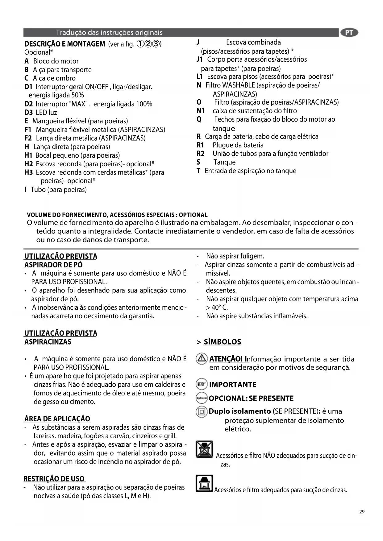 Duplo isolamento (SE PRESENTE): é uma proteção suplementar de isolamento elétrico. Acessórios e filtro NÃO adequados para sucção de cin- zas. Acessórios e filtro adequados para sucção de cinzas. Tradução das instruções originais VOLUME DO FORNECIMENTO, ACESSÓRIOS ESPECIAIS : OPTIONAL O volume de fornecimento do aparelho é ilustrado na embalagem. Ao desembalar, inspeccionar o con- teúdo quanto a integralidade. Contacte imediatamente o vendedor, em caso de falta de acessórios ou no caso de danos de transporte. 29SEGURANÇA
