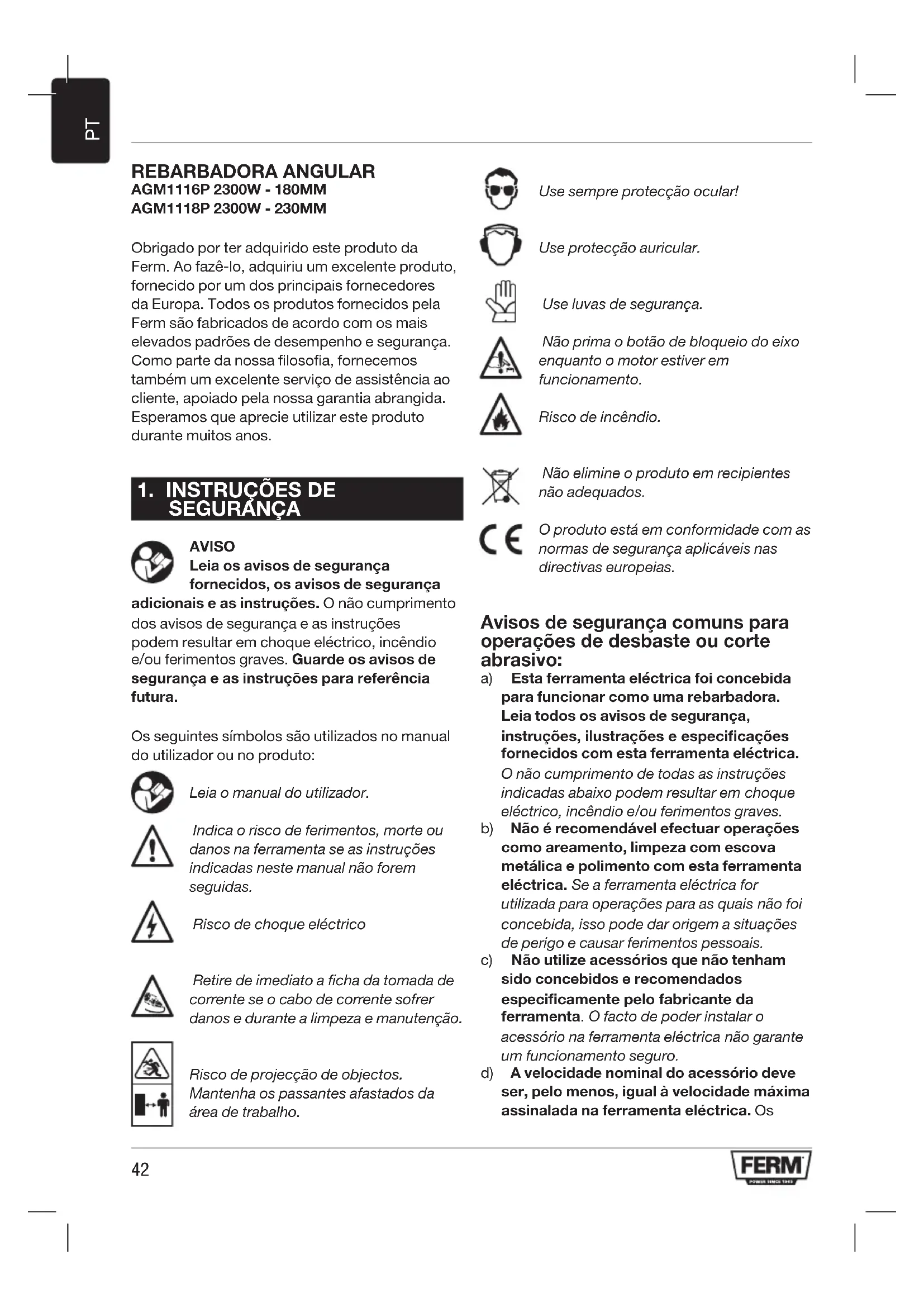 SEGURANÇA AVISO Leia os avisos de segurança fornecidos, os avisos de segurança adicionais e as instruções. O não cumprimento dos avisos de segurança e as instruções podem resultar em choque eléctrico, incêndio e/ou ferimentos graves. Guarde os avisos de segurança e as instruções para referência futura. Os seguintes símbolos são utilizados no manual do utilizador ou no produto: Leia o manual do utilizador. Indica o risco de ferimentos, morte ou danos na ferramenta se as instruções indicadas neste manual não forem seguidas. Risco de choque eléctrico Retire de imediato a ficha da tomada de corrente se o cabo de corrente sofrer danos e durante a limpeza e manutenção. Risco de projecção de objectos. Mantenha os passantes afastados da área de trabalho. Use sempre protecção ocular! Use protecção auricular. Use luvas de segurança. Não prima o botão de bloqueio do eixo enquanto o motor estiver em funcionamento. Risco de incêndio. Não elimine o produto em recipientes não adequados. O produto está em conformidade com as normas de segurança aplicáveis nas directivas europeias. Avisos de segurança comuns para operações de desbaste ou corte abrasivo: a) Esta ferramenta eléctrica foi concebida para funcionar como uma rebarbadora. Leia todos os avisos de segurança, instruções, ilustrações e especicações fornecidos com esta ferramenta eléctrica. O não cumprimento de todas as instruções indicadas abaixo podem resultar em choque eléctrico, incêndio e/ou ferimentos graves. b) Não é recomendável efectuar operações como areamento, limpeza com escova metálica e polimento com esta ferramenta eléctrica. Se a ferramenta eléctrica for utilizada para operações para as quais não foi concebida, isso pode dar origem a situações de perigo e causar ferimentos pessoais. c) Não utilize acessórios que não tenham sido concebidos e recomendados especicamente pelo fabricante da ferramenta. O facto de poder instalar o acessório na ferramenta eléctrica não garante um funcionamento seguro. d) A velocidade nominal do acessório deve ser, pelo menos, igual à velocidade máxima assinalada na ferramenta eléctrica. Os43
