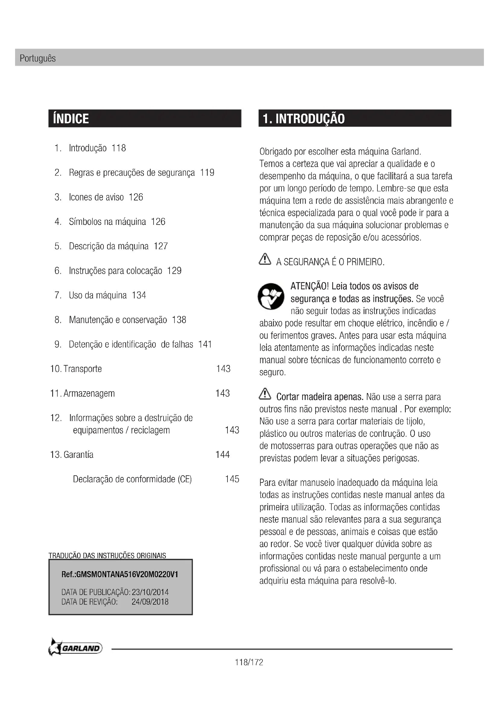Declaração de conformidade (CE) 145 Obrigado por escolher esta máquina Garland. Temos a certeza que vai apreciar a qualidade e o desempenho da máquina, o que facilitará a sua tarefa por um longo período de tempo. Lembre-se que esta máquina tem a rede de assistência mais abrangente e técnica especializada para o qual você pode ir para a manutenção da sua máquina solucionar problemas e comprar peças de reposição e/ou acessórios. A SEGURANÇA É O PRIMEIRO. ATENÇÃO! Leia todos os avisos de segurança e todas as instruções. Se você não seguir todas as instruções indicadas abaixo pode resultar em choque elétrico, incêndio e / ou ferimentos graves. Antes para usar esta máquina leia atentamente as informações indicadas neste manual sobre técnicas de funcionamento correto e seguro. Cortar madeira apenas. Não use a serra para outros fins não previstos neste manual . Por exemplo: Não use a serra para cortar materiais de tijolo, plástico ou outros materias de contrução. O uso de motosserras para outras operações que não as previstas podem levar a situações perigosas. Para evitar manuseio inadequado da máquina leia todas as instruções contidas neste manual antes da primeira utilização. Todas as informações contidas neste manual são relevantes para a sua segurança pessoal e de pessoas, animais e coisas que estão ao redor. Se você tiver qualquer dúvida sobre as informações contidas neste manual pergunte a um profissional ou vá para o estabelecimento onde adquiriu esta máquina para resolvê-lo.