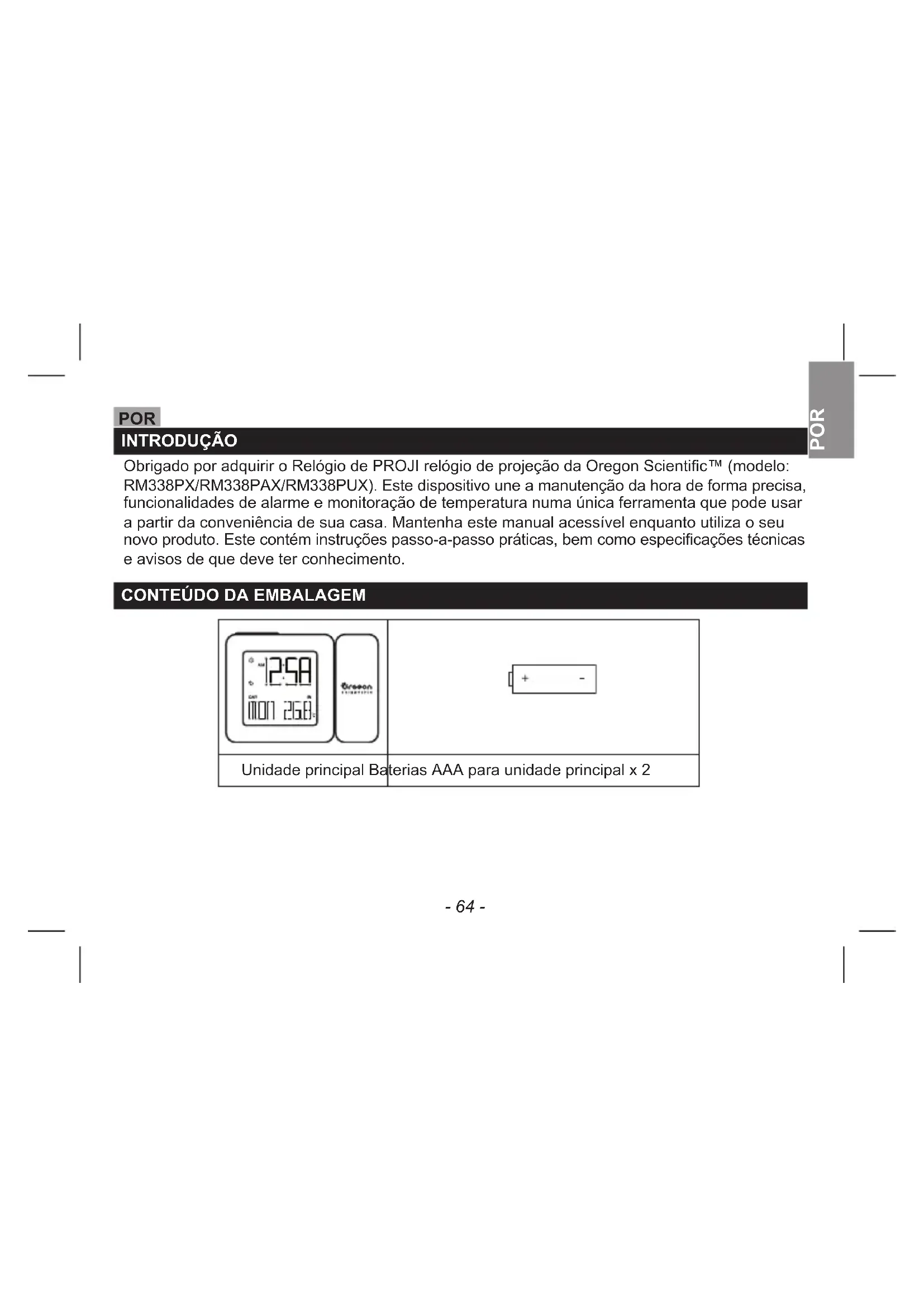 POR INTRODUÇÃO Obrigado por adquirir o Relógio de PROJI relógio de projeção da Oregon Scientic™ (modelo: RM338PX/RM338PAX/RM338PUX). Este dispositivo une a manutenção da hora de forma precisa, funcionalidades de alarme e monitoração de temperatura numa única ferramenta que pode usar a partir da conveniência de sua casa. Mantenha este manual acessível enquanto utiliza o seu novo produto. Este contém instruções passo-a-passo práticas, bem como especicações técnicas e avisos de que deve ter conhecimento.