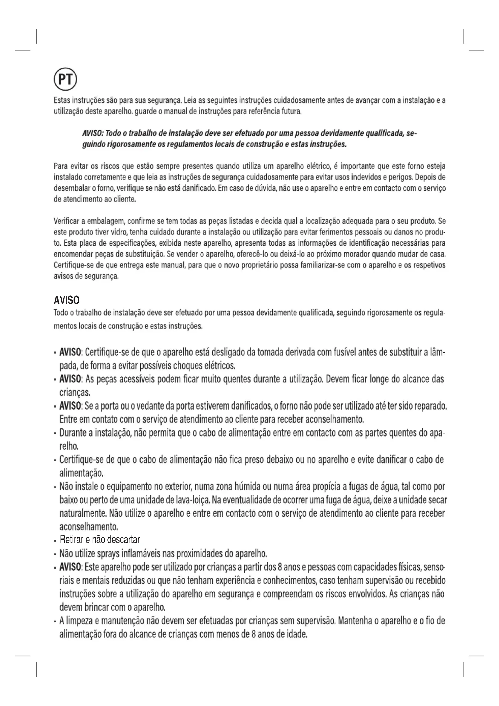FUSE ONPara evitar os riscos que estão sempre presentes quando utiliza um aparelho elétrico, é importante que este aparelho esteja instalado corretamente e que leia as instruções de segurança cuidadosamente para evitar usos indevidos e perigos. Guarde este manual de instruções para consulta futura e entregue-o a futuros proprietários. Depois de desembalar o aparelho, verifique se não está danificado. Em caso de dúvida, não use o aparelho e entre em contacto com o serviço de atendimento ao cliente. O fabricante está isento de qualquer responsabilidade por danos pessoais ou materiais resultantes de uma instalação incorreta ou inadequada do aparelho. Qualquer instalação elétrica permanente deve estar em conformidade com a mais recente regula- mentação aplicável a cablagem para o seu país e, para a sua própria segurança, a instalação elétrica deve ser efetuada por um eletricista qualificado ou um empreiteiro. Instalação