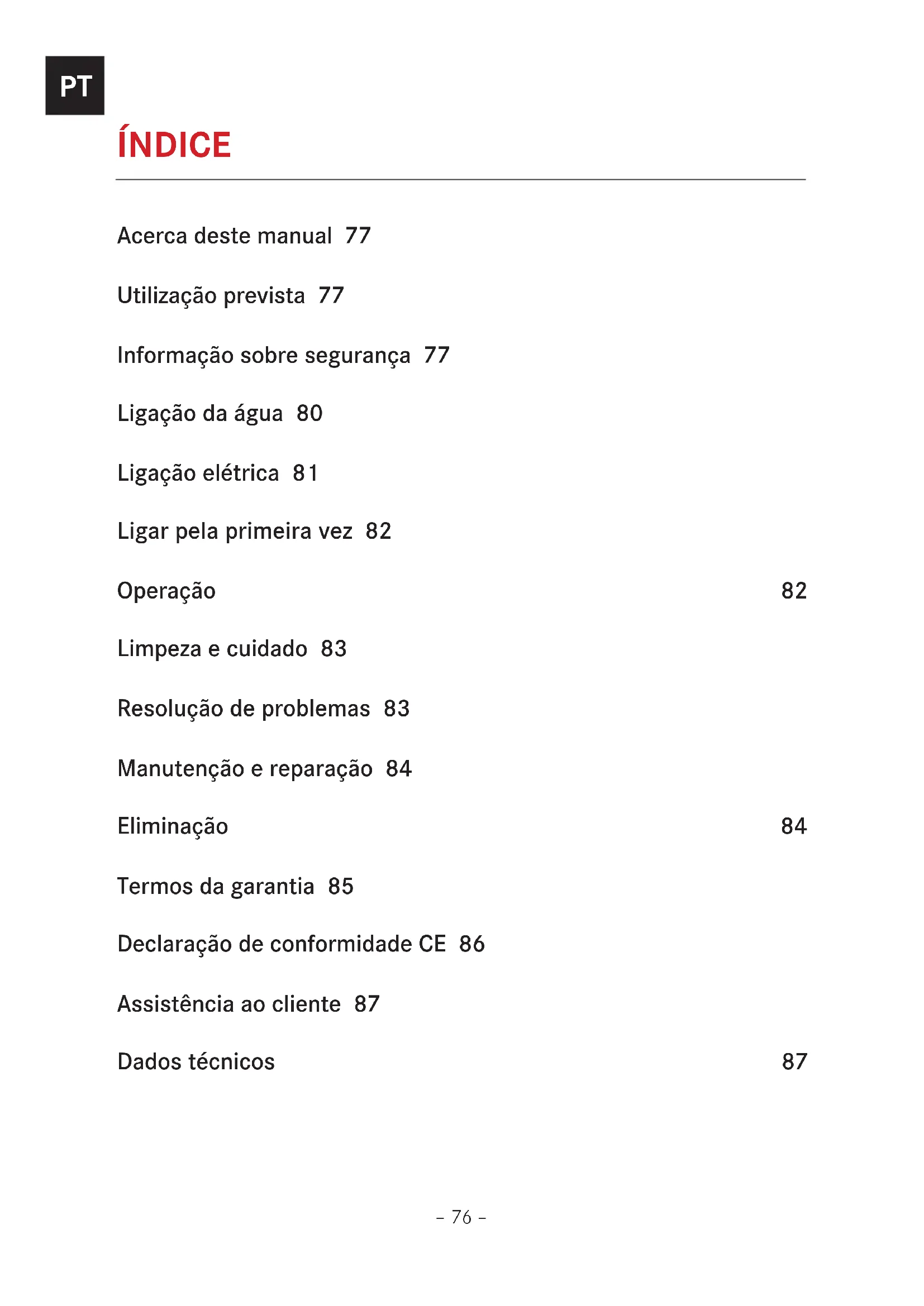 ÍNDICE Acerca deste manual 77 Utilização prevista 77 Informação sobre segurança 77 Ligação da água 80 Ligação elétrica 81 Ligar pela primeira vez 82 Operação 82 Limpeza e cuidado 83 Resolução de problemas 83 Manutenção e reparação 84 Eliminação 84 Termos da garantia 85 Declaração de conformidade CE 86 Assistência ao cliente 87 Dados técnicos 87– 77 –