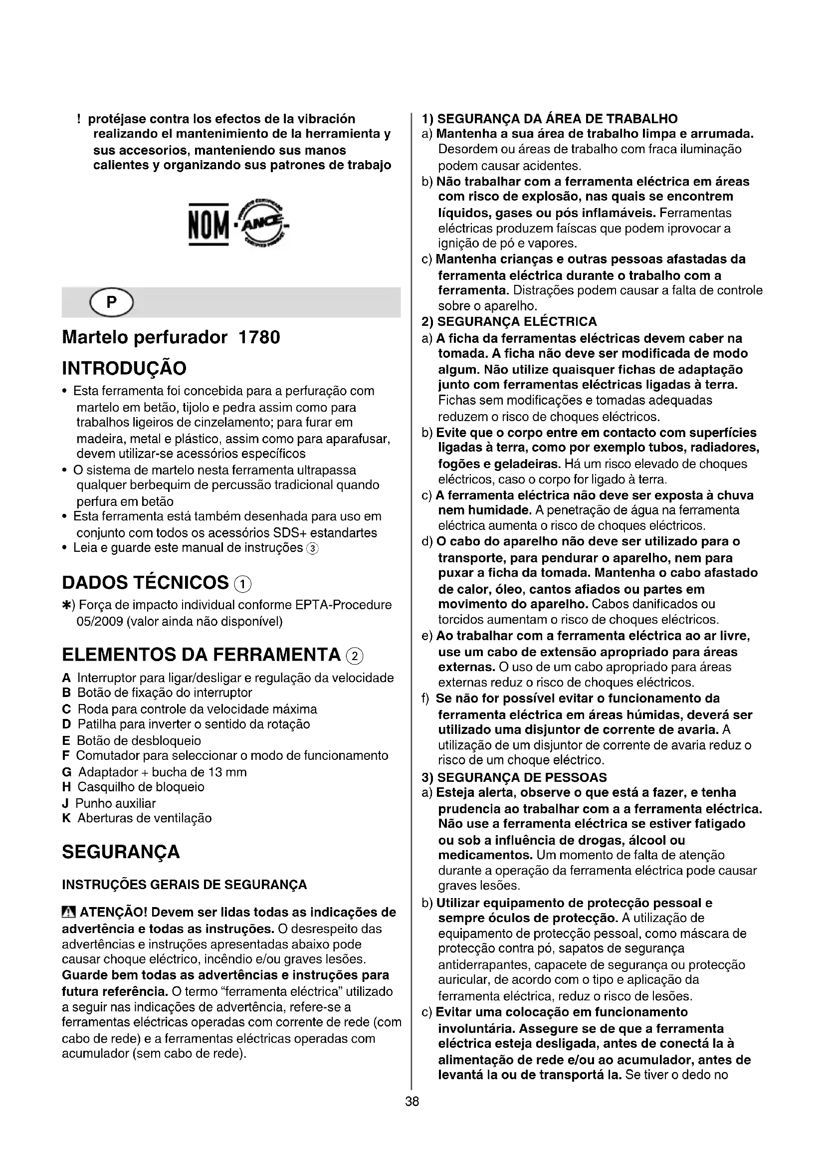 A Interruptor para ligar/desligar e regulação da velocidade B Botão de xação do interruptor C Roda para controle da velocidade máxima D Patilha para inverter o sentido da rotação E Botão de desbloqueio F Comutador para seleccionar o modo de funcionamento G Adaptador + bucha de 13 mm H Casquilho de bloqueio J Punho auxiliar K Aberturas de ventilação SEGURANÇA