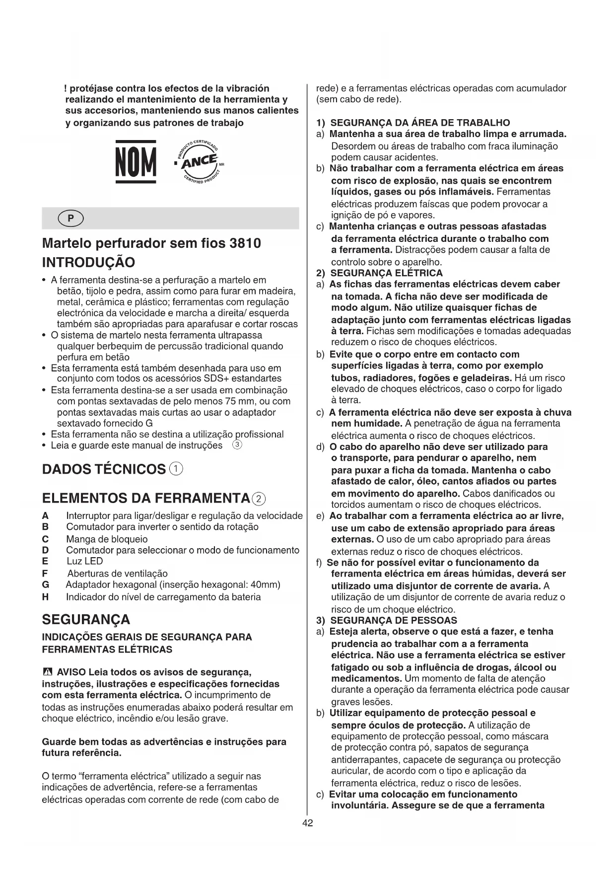 - AVISO Leia todos os avisos de segurança, instruções, ilustrações e especicações fornecidas com esta ferramenta eléctrica. O incumprimento de todas as instruções enumeradas abaixo poderá resultar em choque eléctrico, incêndio e/ou lesão grave. Guarde bem todas as advertências e instruções para futura referência. O termo “ferramenta eléctrica” utilizado a seguir nas indicações de advertência, refere-se a ferramentas eléctricas operadas com corrente de rede (com cabo de43 g) Use a ferramenta eléctrica, os acessórios os bits da ferramenta etc., de acordo com estas instruções. Considere também as condições de trabalho e o trabalho a ser efectuado. A utilização da ferramenta eléctrica para outros ns que os previstos, pode resultar em situações perigosas. h) Mantenha os punhos e as superfícies de agarrar secas, limpas e livres de óleo e massa consistente. Punhos e superfícies de agarrar escorregadias não permitem o manuseio e controlo seguros da ferramenta em situações inesperadas.