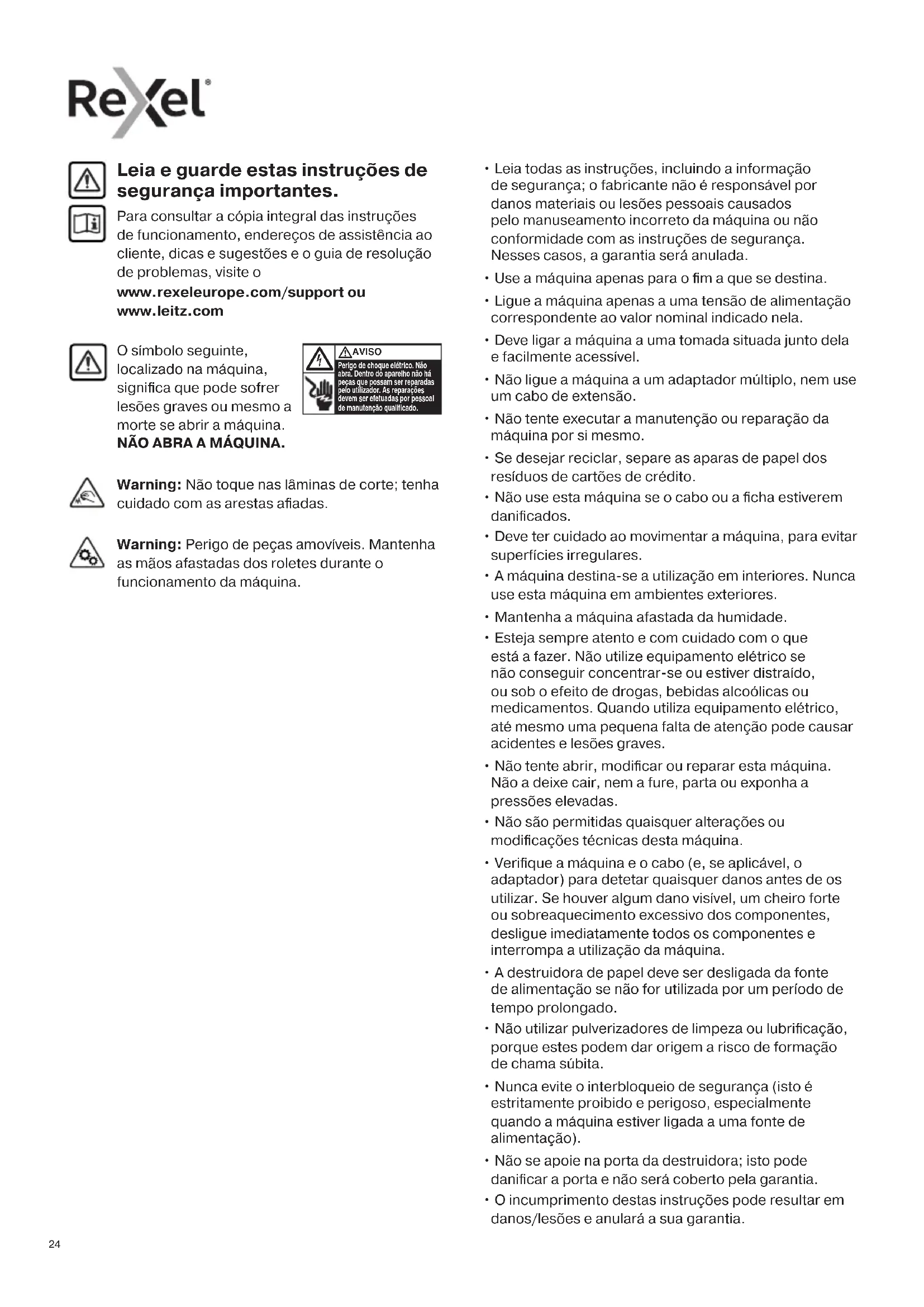 - O incumprimento destas instruções pode resultar em danos/lesões e anulará a sua garantia. Leia e guarde estas instruções de segurança importantes. Para consultar a cópia integral das instruções de funcionamento, endereços de assistência ao cliente, dicas e sugestões e o guia de resolução de problemas, visite o www.rexeleurope.com/support ou www.leitz.com