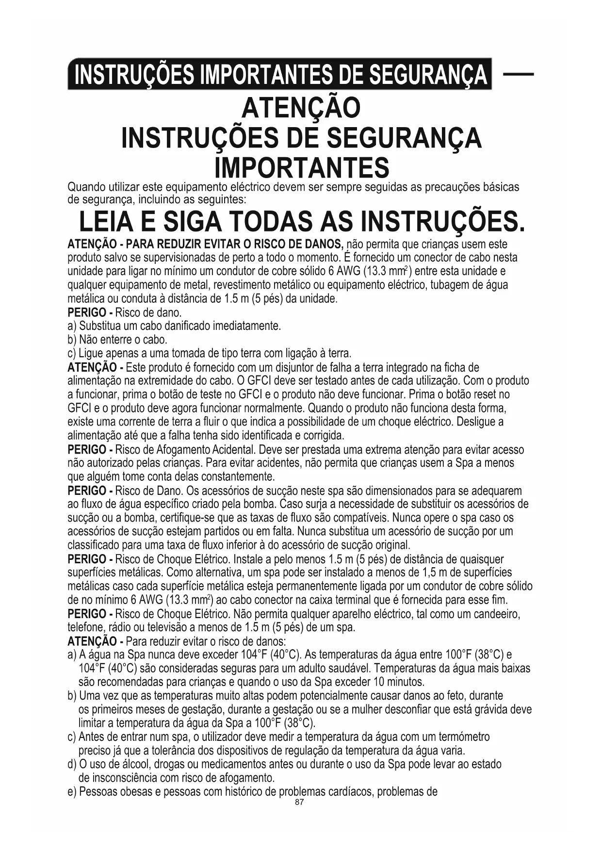 IMPORTANTES Quando utilizar este equipamento eléctrico devem ser sempre seguidas as precauções básicas de segurança, incluindo as seguintes: LEIA E SIGA TODAS AS INSTRUÇÕES. ATENÇÃO - PARA REDUZIR EVITAR O RISCO DE DANOS, não permita que crianças usem este produto salvo se supervisionadas de perto a todo o momento. É fornecido um conector de cabo nesta unidade para ligar no mínimo um condutor de cobre sólido 6 AWG (13.3 mm ) entre esta unidade e qualquer equipamento de metal, revestimento metálico ou equipamento eléctrico, tubagem de água metálica ou conduta à distância de 1.5 m (5 pés) da unidade.PERIGO - Risco de dano.a) Substitua um cabo danificado imediatamente.b) Não enterre o cabo.c) Ligue apenas a uma tomada de tipo terra com ligação à terra.ATENÇÃO - Este produto é fornecido com um disjuntor de falha a terra integrado na ficha de alimentação na extremidade do cabo. O GFCI deve ser testado antes de cada utilização. Com o produto a funcionar, prima o botão de teste no GFCI e o produto não deve funcionar. Prima o botão reset no GFCI e o produto deve agora funcionar normalmente. Quando o produto não funciona desta forma, existe uma corrente de terra a fluir o que indica a possibilidade de um choque eléctrico. Desligue a alimentação até que a falha tenha sido identificada e corrigida. PERIGO - Risco de Afogamento Acidental. Deve ser prestada uma extrema atenção para evitar acesso não autorizado pelas crianças. Para evitar acidentes, não permita que crianças usem a Spa a menos que alguém tome conta delas constantemente.PERIGO - Risco de Dano. Os acessórios de sucção neste spa são dimensionados para se adequarem ao fluxo de água específico criado pela bomba. Caso surja a necessidade de substituir os acessórios de sucção ou a bomba, certifique-se que as taxas de fluxo são compatíveis. Nunca opere o spa caso os acessórios de sucção estejam partidos ou em falta. Nunca substitua um acessório de sucção por um classificado para uma taxa de fluxo inferior à do acessório de sucção original. PERIGO - Risco de Choque Elétrico. Instale a pelo menos 1.5 m (5 pés) de distância de quaisquer superfícies metálicas. Como alternativa, um spa pode ser instalado a menos de 1,5 m de superfícies metálicas caso cada superfície metálica esteja permanentemente ligada por um condutor de cobre sólido de no mínimo 6 AWG (13.3 mm ) ao cabo conector na caixa terminal que é fornecida para esse fim. PERIGO - Risco de Choque Elétrico. Não permita qualquer aparelho eléctrico, tal como um candeeiro, telefone, rádio ou televisão a menos de 1.5 m (5 pés) de um spa.ATENÇÃO - Para reduzir evitar o risco de danos:a) A água na Spa nunca deve exceder 104°F (40°C). As temperaturas da água entre 100°F (38°C) e 104°F (40°C) são consideradas seguras para um adulto saudável. Temperaturas da água mais baixas são recomendadas para crianças e quando o uso da Spa exceder 10 minutos.b) Uma vez que as temperaturas muito altas podem potencialmente causar danos ao feto, duranteos primeiros meses de gestação, durante a gestação ou se a mulher desconfiar que está grávida deve limitar a temperatura da água da Spa a 100°F (38°C).c) Antes de entrar num spa, o utilizador deve medir a temperatura da água com um termómetro preciso já que a tolerância dos dispositivos de regulação da temperatura da água varia.d) O uso de álcool, drogas ou medicamentos antes ou durante o uso da Spa pode levar ao estado de insconsciência com risco de afogamento.e) Pessoas obesas e pessoas com histórico de problemas cardíacos, problemas de hipotensão ou hipertensão, problemas no sistema circulatório ou diabetes devem consultar um médico antes de usar a Spa.f) Pessoas que usam medicamentos devem consultar um médico antes de usar a Spa uma vez que a medicação pode levar ao adormentamento enquanto outras medicações podem afetar o batimento cardíaco, pressão arterial e circulação.ATENÇÃO: PARA EVITAR RISCOS DE CHOQUE ELÉTRICO, NÃO USE A SPA QUANTO ESTIVER CHOVENDO.ATENÇÃO: A água normalmente atrai a atenção das crianças; Sempre coloque a tampa da Spa depois de usá-la.ATENÇÃO: PARA REDUZIR EVITAR O RISCO DE DANOS: Nunca adicione água que esteja a uma temperatura superior a 104°F (40°C) ao Spa.
