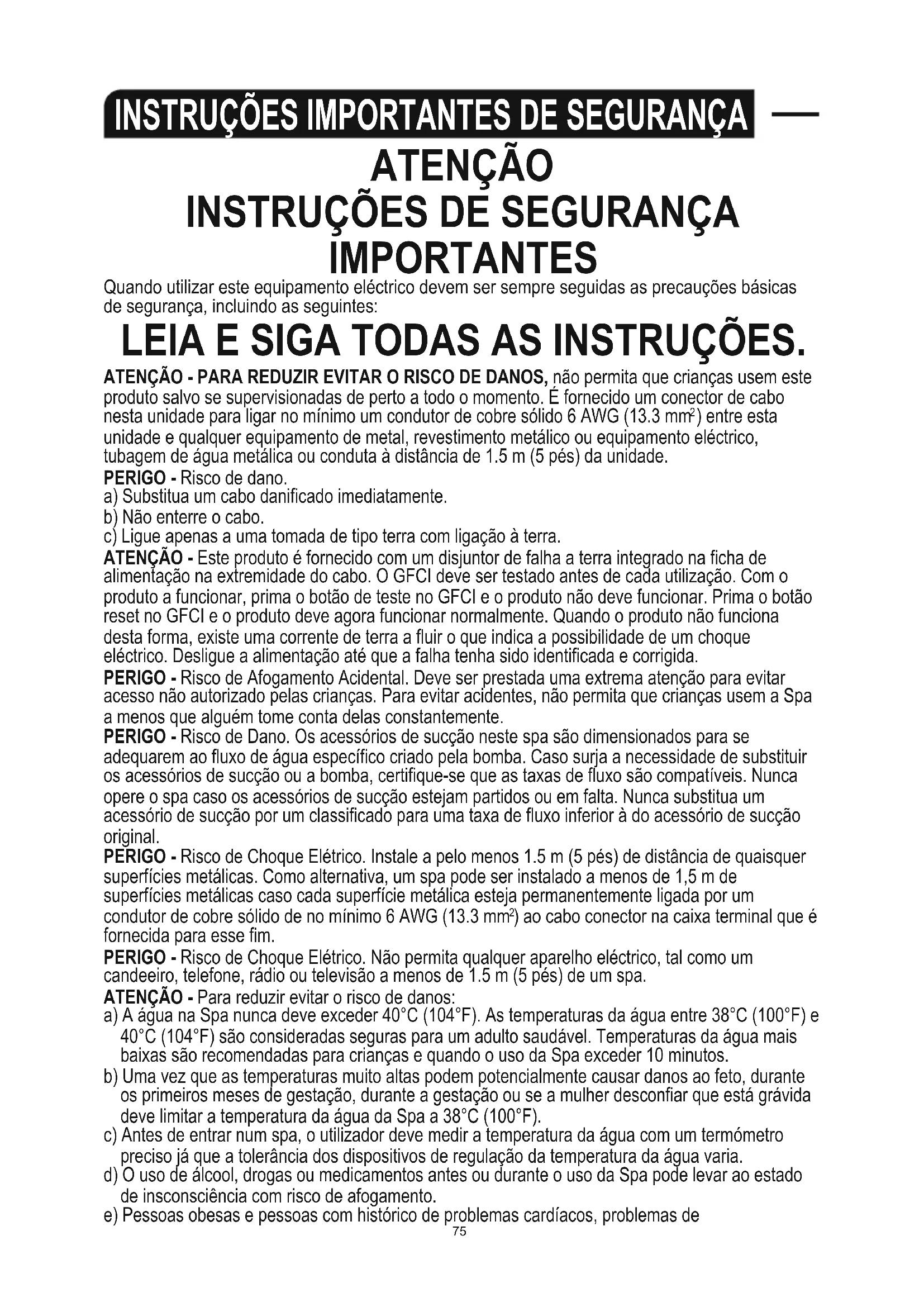 ) entre esta unidade e qualquer equipamento de metal, revestimento metálico ou equipamento eléctrico, tubagem de água metálica ou conduta à distância de 1.5 m (5 pés) da unidade. PERIGO - Risco de dano. a) Substitua um cabo danificado imediatamente. b) Não enterre o cabo. c) Ligue apenas a uma tomada de tipo terra com ligação à terra. ATENÇÃO - Este produto é fornecido com um disjuntor de falha a terra integrado na ficha de alimentação na extremidade do cabo. O GFCI deve ser testado antes de cada utilização. Com o produto a funcionar, prima o botão de teste no GFCI e o produto não deve funcionar. Prima o botão reset no GFCI e o produto deve agora funcionar normalmente. Quando o produto não funciona desta forma, existe uma corrente de terra a fluir o que indica a possibilidade de um choque eléctrico. Desligue a alimentação até que a falha tenha sido identificada e corrigida. PERIGO - Risco de Afogamento Acidental. Deve ser prestada uma extrema atenção para evitar acesso não autorizado pelas crianças. Para evitar acidentes, não permita que crianças usem a Spa a menos que alguém tome conta delas constantemente. PERIGO - Risco de Dano. Os acessórios de sucção neste spa são dimensionados para se adequarem ao fluxo de água específico criado pela bomba. Caso surja a necessidade de substituir os acessórios de sucção ou a bomba, certifique-se que as taxas de fluxo são compatíveis. Nunca opere o spa caso os acessórios de sucção estejam partidos ou em falta. Nunca substitua um acessório de sucção por um classificado para uma taxa de fluxo inferior à do acessório de sucção original. PERIGO - Risco de Choque Elétrico. Instale a pelo menos 1.5 m (5 pés) de distância de quaisquer superfícies metálicas. Como alternativa, um spa pode ser instalado a menos de 1,5 m de superfícies metálicas caso cada superfície metálica esteja permanentemente ligada por um condutor de cobre sólido de no mínimo 6 AWG (13.3 mm