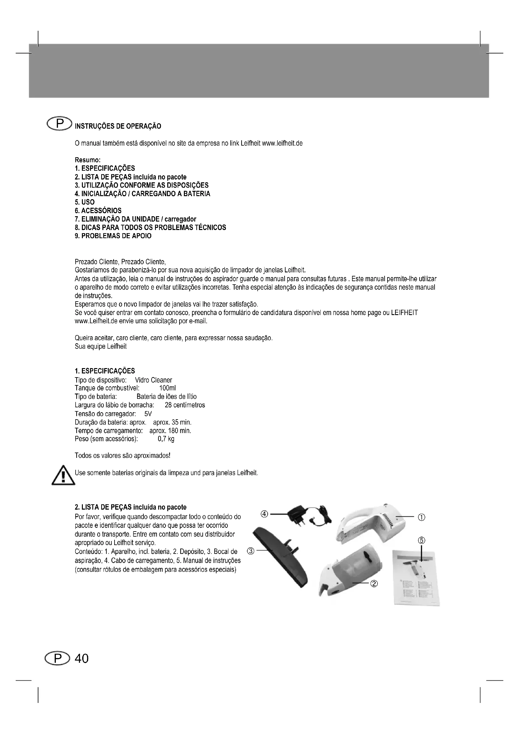 Prezado Cliente, Prezado Cliente, Gostaríamosdeparabenizá-loporsuanovaaquisiçãodelimpadordejanelasLeifheit. Antes da utilização, leia o manual de instruções do aspirador guarde o manual para consultas futuras . Este manual permite-lhe utilizar o aparelho de modo correto e evitar utilizações incorretas. Tenha especial atenção às indicações de segurança contidas neste manual de instruções. Esperamos que o novo limpador de janelas vai lhe trazer satisfação. Sevocêquiserentraremcontatoconosco,preenchaoformuláriodecandidaturadisponívelemnossahomepageouLEIFHEIT www.Leifheit.de envie uma solicitação por e-mail. Queira aceitar, caro cliente, caro cliente, para expressar nossa saudação. Sua equipe Leifheit