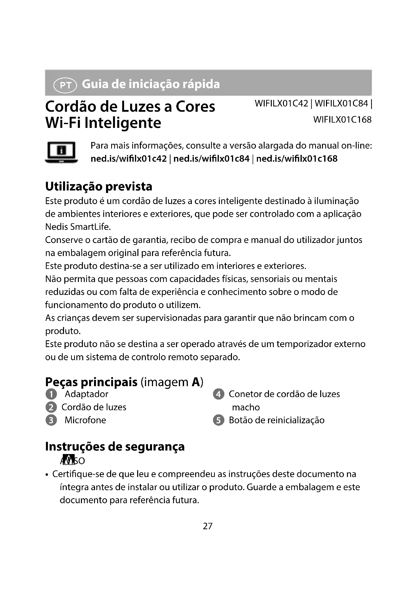Guia de iniciação rápida Cordão de Luzes a Cores Wi-Fi Inteligente WIFILX01C42 | WIFILX01C84 | WIFILX01C168Para mais informações, consulte a versão alargada do manual on-line: ned.is/wilx01c42 | ned.is/wilx01c84 | ned.is/wilx01c168 Utilização prevista Este produto é um cordão de luzes a cores inteligente destinado à iluminação de ambientes interiores e exteriores, que pode ser controlado com a aplicação Nedis SmartLife.Conserve o cartão de garantia, recibo de compra e manual do utilizador juntos na embalagem original para referência futura.Este produto destina-se a ser utilizado em interiores e exteriores.Não permita que pessoas com capacidades físicas, sensoriais ou mentais reduzidas ou com falta de experiência e conhecimento sobre o modo de funcionamento do produto o utilizem.As crianças devem ser supervisionadas para garantir que não brincam com o produto.Este produto não se destina a ser operado através de um temporizador externo ou de um sistema de controlo remoto separado. Peças principais (imagem A) 1 Adaptador 2 Cordão de luzes 3 Microfone 4 Conetor de cordão de luzes macho 5 Botão de reinicialização Instruções de segurança