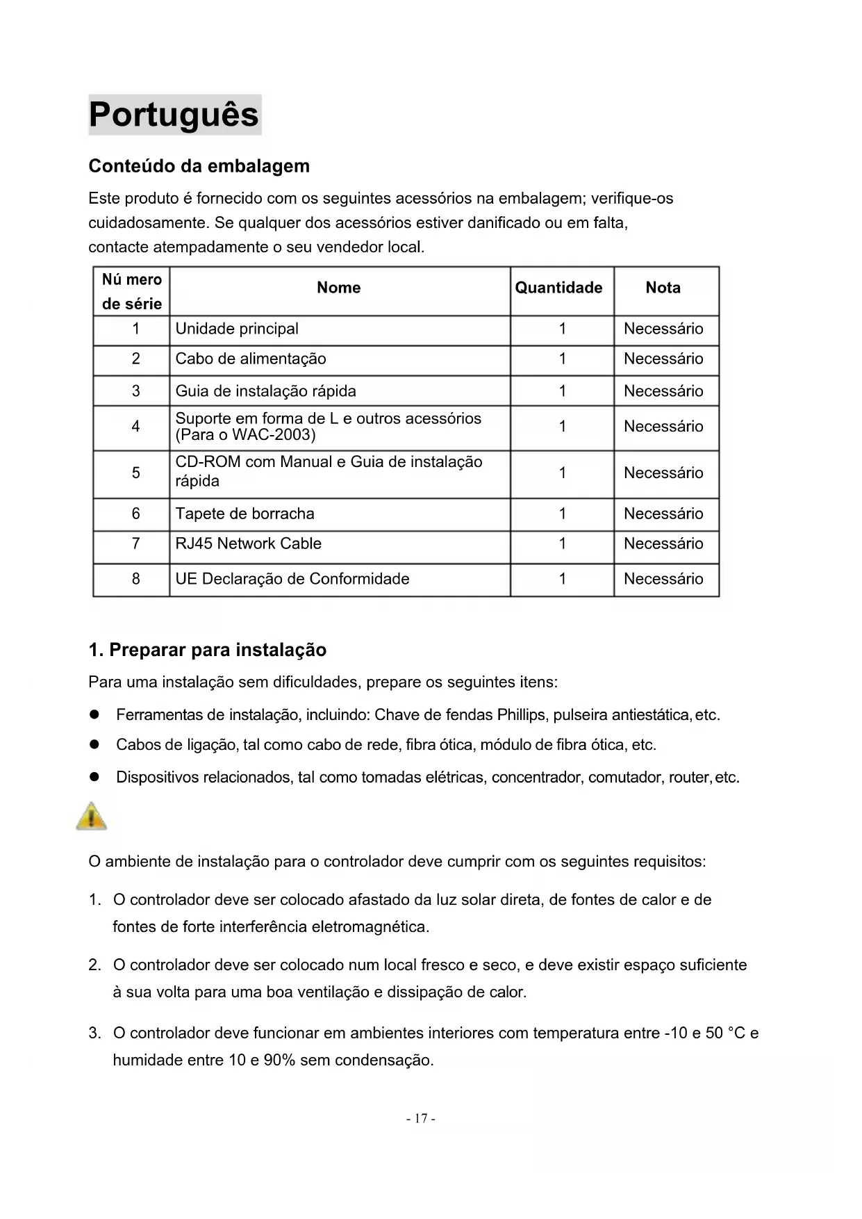 Para uma instalação sem dificuldades, prepare os seguintes itens: l Ferramentas de instalação, incluindo: Chave de fendas Phillips, pulseira antiestática, etc. l Cabos de ligação, tal como cabo de rede, fibra ótica, módulo de fibra ótica, etc. l Dispositivos relacionados, tal como tomadas elétricas, concentrador, comutador, router, etc. O ambiente de instalação para o controlador deve cumprir com os seguintes requisitos: