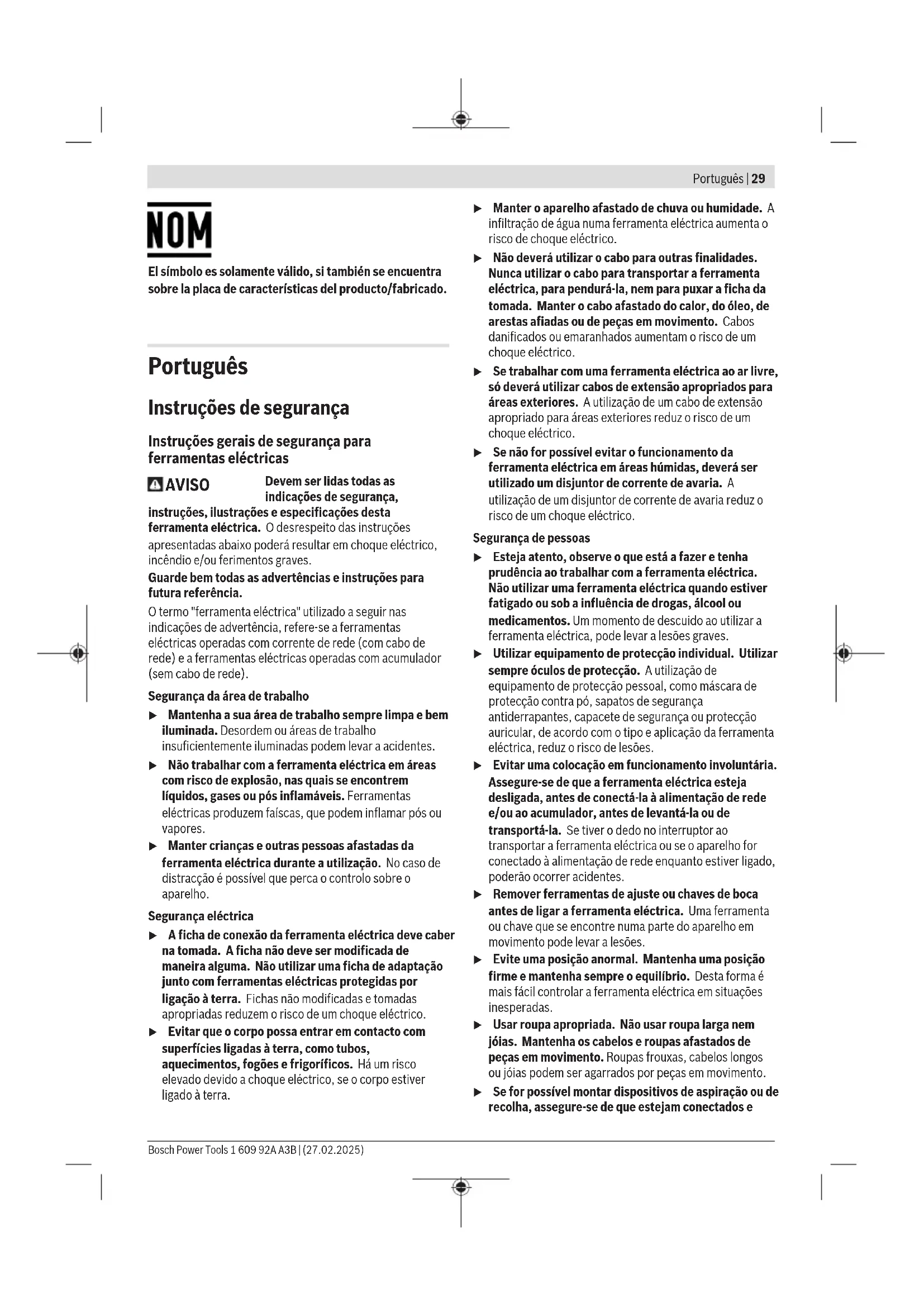 Bosch Power Tools 1 609 92A A3B | (27.02.2025)32 | Português O nível de vibrações indicado nestas instruções e o valor de emissões sonoras foram medidos de acordo com um processo de medição normalizado e podem ser utilizados para a comparação de ferramentas elétricas. Também são adequados para uma avaliação provisória das emissões sonoras e de vibrações. O nível de vibrações indicado e o valor de emissões sonoras representam as aplicações principais da ferramenta elétrica. Se a ferramenta elétrica for utilizada para outras aplicações, com outras ferramentas de trabalho ou com manutenção insuficiente, é possível que o nível de vibrações e de emissões sonoras seja diferente. Isto pode aumentar sensivelmente a emissão sonora e de vibrações para o período completo de trabalho. Para uma estimação exata da emissão sonora e de vibrações, também deveriam ser considerados os períodos nos quais o aparelho está desligado ou funciona, mas não está sendo utilizado. Isto pode reduzir a emissão sonora e de vibrações durante o completo período de trabalho. Além disso também deverão ser estipuladas medidas de segurança para proteger o operador contra o efeito de vibrações, como por exemplo: manutenção de ferramentas elétricas e acessórios, manter as mãos quentes e organização dos processos de trabalho. Montagem u Antes de qualquer trabalho na ferramenta elétrica (p. ex. manutenção, troca de ferramenta, etc.) retire a bateria da mesma. Há perigo de ferimentos se o interruptor de ligar/desligar for acionado involuntariamente. Carregar a bateria u Utilize apenas os carregadores listados nos dados técnicos. Só estes carregadores são apropriados para as baterias de lítio utilizadas na sua ferramenta elétrica. Nota: A bateria é fornecida parcialmente carregada. Para assegurar a completa potência da bateria, a bateria deverá ser carregada completamente no carregador antes da primeira utilização. A bateria de lítio pode ser carregada a qualquer altura, sem que a sua vida útil seja reduzida. Uma interrupção do processo de carga não danifica a bateria. O acumulador de iões de lítio está protegido contra descarga completa pelo sistema "Electronic Cell Protection (ECP)". A ferramenta elétrica é desligada através de um disjuntor de proteção, logo que o acumulador estiver descarregado. A ferramenta de trabalho não se movimenta mais. u Não continuar a premir o interruptor de ligar/desligar após o desligamento automático da ferramenta elétrica. A bateria pode ser danificada. Observe as indicações sobre a eliminação de forma ecológica. Retirar a bateria A bateria (7) possui dois níveis de travamento, que devem evitar, que a bateria caia, caso a tecla de desbloqueio (8) seja premida por acaso. Enquanto a bateria estiver dentro da ferramenta elétrica, ela é mantido em posição por uma mola. Para retirar a bateria (7) pressione a tecla de desbloqueio (8) e puxe a bateria para a frente para a retirar da ferramenta elétrica. Não empregar força. Indicador do nível de carga da bateria Os LEDs verdes do indicador do nível de carga da bateria indicam o nível de carga da bateria. Por motivos de segurança, a consulta do nível de carga só é possível com a ferramenta elétrica parada. Prima a tecla para o indicador do nível de carga da bateria ou para visualizar o nível de carga. Isto também é possível com a bateria removida. Se, depois de premir a tecla para o indicador do nível de carga da bateria, não se acender qualquer LED, a bateria tem defeito e tem de ser substituída. Tipo de bateria GBA 18V... LEDs Capacidade Luz permanente 3× verde 60–100% Luz permanente 2× verde 30–60% Luz permanente 1× verde 5–30% Luz intermitente 1× verde 0–5% Tipo de bateria ProCORE18V... LEDs Capacidade Luz permanente 5× verde 80−100% Luz permanente 4× verde 60−80% Luz permanente 3× verde 40−60% Luz permanente 2× verde 20−40% Luz permanente 1× verde 5−20% Luz intermitente 1× verde 0−5% Troca de ferramenta (verfiguraA) u Antes de qualquer trabalho na ferramenta elétrica (p. ex. manutenção, troca de ferramenta, etc.) retire a bateria da mesma. Há perigo de ferimentos se o interruptor de ligar/desligar for acionado involuntariamente. Retirar o limitador de profundidade(4) da ferramenta elétrica. Puxar a ponta de aparafusar(1) para fora. Se necessário, pode ser removido e trocado o porta-bits universal(14). Se necessário, utilizar uma pinça. Depois de trocada a ferramenta, voltar a colocar o limitador de profundidade(4). 1 609 92A A3B | (27.02.2025) Bosch Power ToolsPortuguês | 33 Funcionamento Colocação em funcionamento Colocar a bateria Nota: A utilização de baterias não indicadas para a sua ferramenta elétrica pode causar falhas de funcionamento ou danos na ferramenta elétrica. Coloque o comutador do sentido de rotação (5) no centro para evitar um ligamento inadvertido. Coloque a bateria carregada (7) no punho até esta encaixar de forma audível e ficar à face com o punho. Ajustar o sentido de rotação (ver figurasE–F) Com o comutador de sentido de rotação (5) é possível alterar o sentido de rotação da ferramenta elétrica. Com o interruptor de ligar/desligar pressionado (12) isto no entanto não é possível. Rotação à direita: deslocar o comutador do sentido de rotação(5) no lado esquerdo da ferramenta elétrica no sentido da parte da frente da ferramenta elétrica. O comutador do sentido de rotação(5) no lado direito da ferramenta elétrica desloca-se automaticamente para trás. Rotação à esquerda: deslocar o comutador do sentido de rotação(5) no lado esquerdo da ferramenta elétrica para trás (ou seja, afastado do lado da frente da ferramenta elétrica). O comutador do sentido de rotação(5) no lado direito da ferramenta elétrica desloca-se automaticamente para a frente. Ligar e desligar Para a colocação em funcionamento da ferramenta elétrica dev