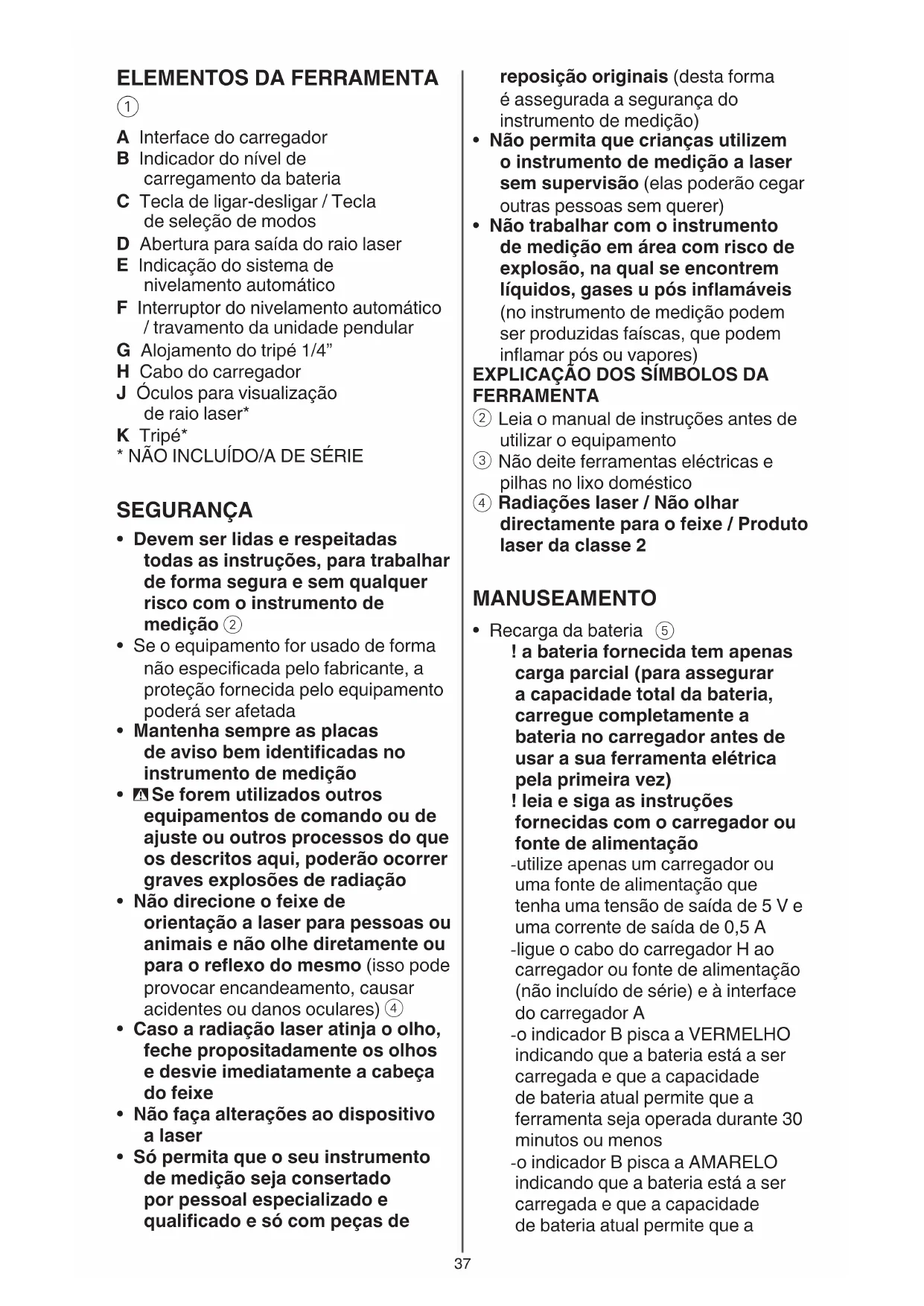 - se a função de auto-nivelamento não for possível, por ex. porque a superfície em que se encontra a ferramenta de medição tem um desvio de mais de 4° em relação ao plano horizontal, as linhas laser piscam e o indicador E acende a vermelho - nesse caso, coloque o instrumento de medição na horizontal e aguarde o auto-nivelamento - assim que a ferramenta de medição estiver outra vez no alcance de auto-nivelamento de ±4°, as linhas laser acendem-se de forma contínua e o indicador E apaga-se - fora da faixa de nivelamento automático de ±4° não é possível trabalhar com o nivelamento automático, caso contrário não pode ser assegurado que as linhas de laser percorram com ângulo reto entre si - o instrumento de medição é automaticamente renivelado se ocorrerem abalos ou mudanças de posição durante o funcionamento ferramenta seja operada durante mais de 30 minutos - o indicador B pisca a VERDE indicando que a bateria está carregada com mais de 90% da sua capacidade total - o indicador B acende-se a VERDE para indicar que a bateria está completamente carregada