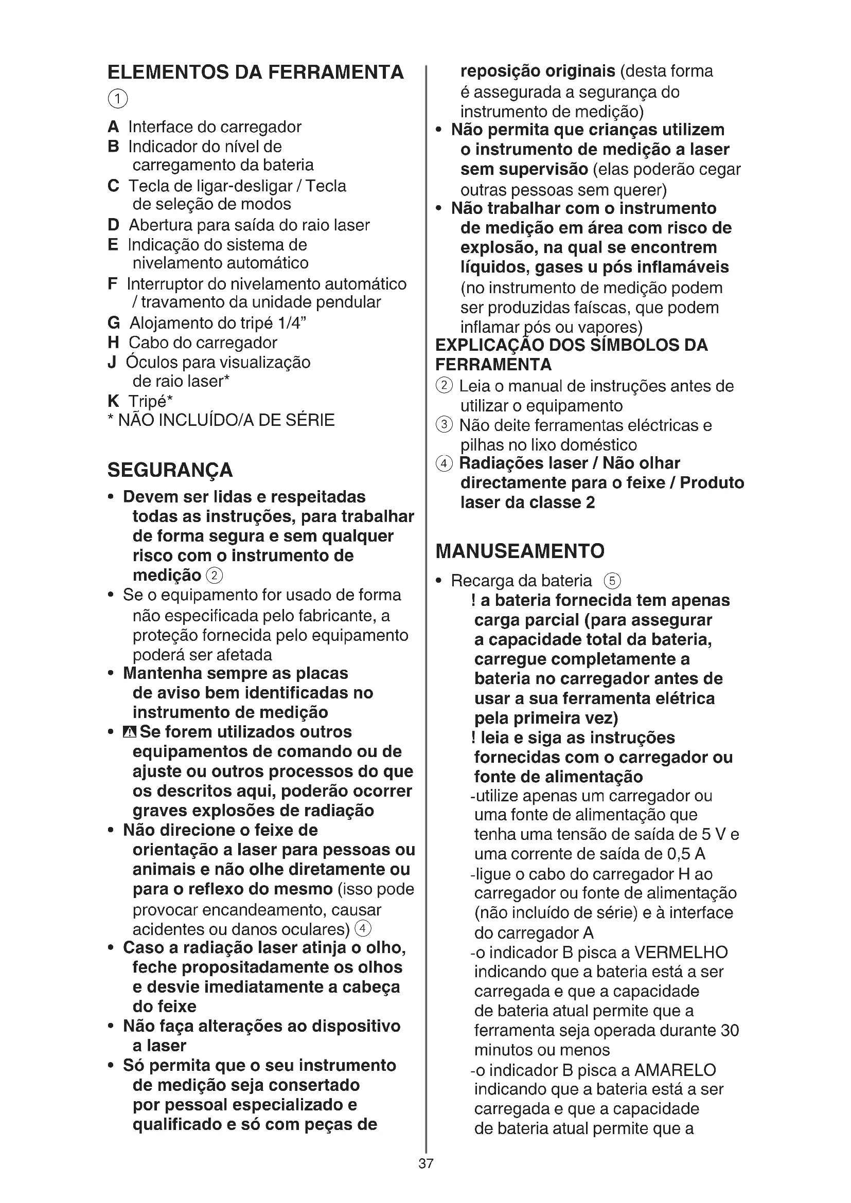 A Interface do carregador B Indicador do nível de carregamento da bateria C Tecla de ligar-desligar / Tecla de seleção de modos D Abertura para saída do raio laser E Indicação do sistema de nivelamento automático F Interruptor do nivelamento automático / travamento da unidade pendular G Alojamento do tripé 1/4” H Cabo do carregador J Óculos para visualização de raio laser* K Tripé*