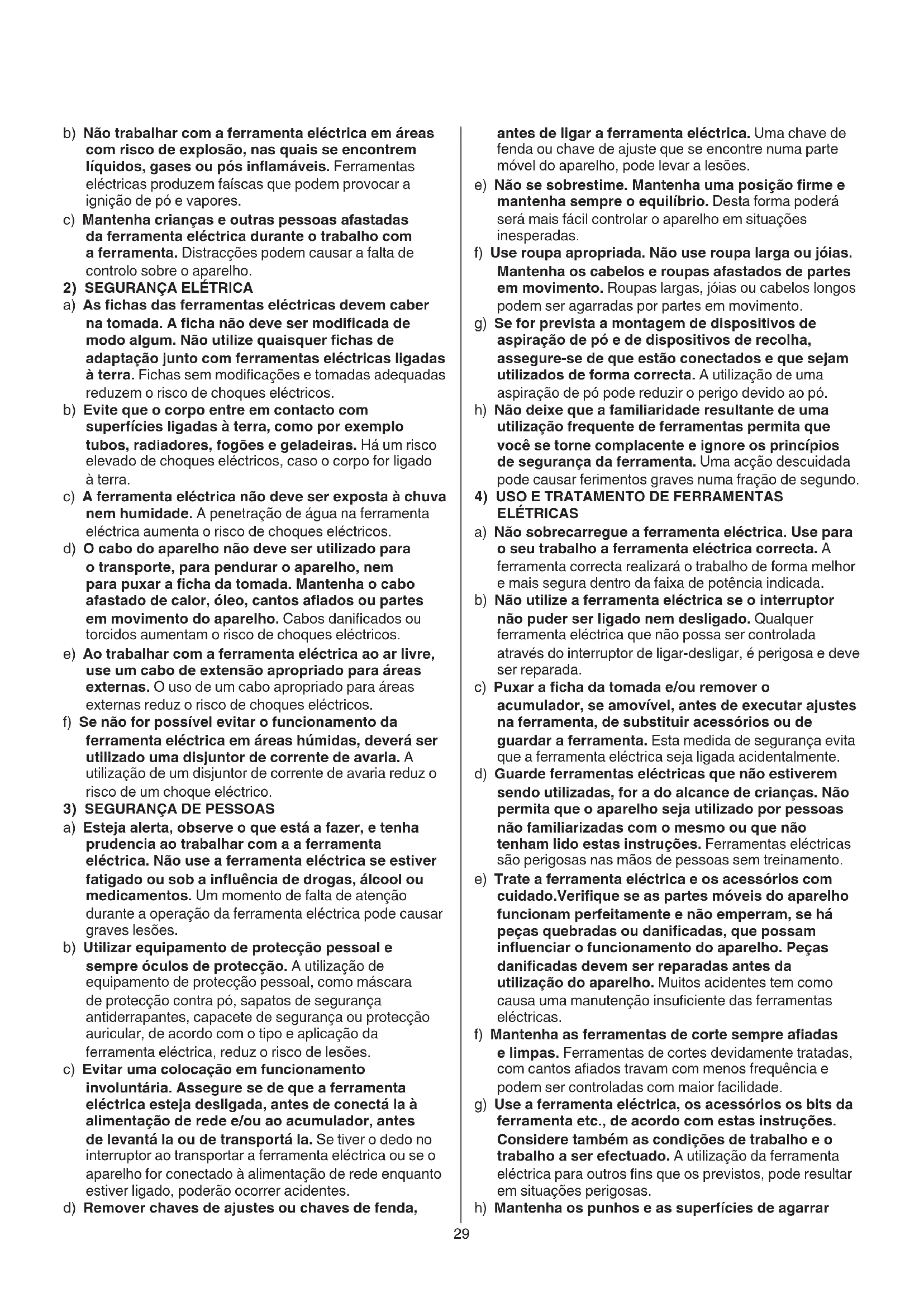 a) Esteja alerta, observe o que está a fazer, e tenha prudencia ao trabalhar com a a ferramenta eléctrica. Não use a ferramenta eléctrica se estiver fatigado ou sob a inuência de drogas, álcool ou medicamentos. Um momento de falta de atenção durante a operação da ferramenta eléctrica pode causar graves lesões. b) Utilizar equipamento de protecção pessoal e sempre óculos de protecção. A utilização de equipamento de protecção pessoal, como máscara de protecção contra pó, sapatos de segurança antiderrapantes, capacete de segurança ou protecção auricular, de acordo com o tipo e aplicação da ferramenta eléctrica, reduz o risco de lesões. c) Evitar uma colocação em funcionamento involuntária. Assegure se de que a ferramenta eléctrica esteja desligada, antes de conectá la à alimentação de rede e/ou ao acumulador, antes de levantá la ou de transportá la. Se tiver o dedo no interruptor ao transportar a ferramenta eléctrica ou se o aparelho for conectado à alimentação de rede enquanto estiver ligado, poderão ocorrer acidentes. d) Remover chaves de ajustes ou chaves de fenda,30 GENERAL
