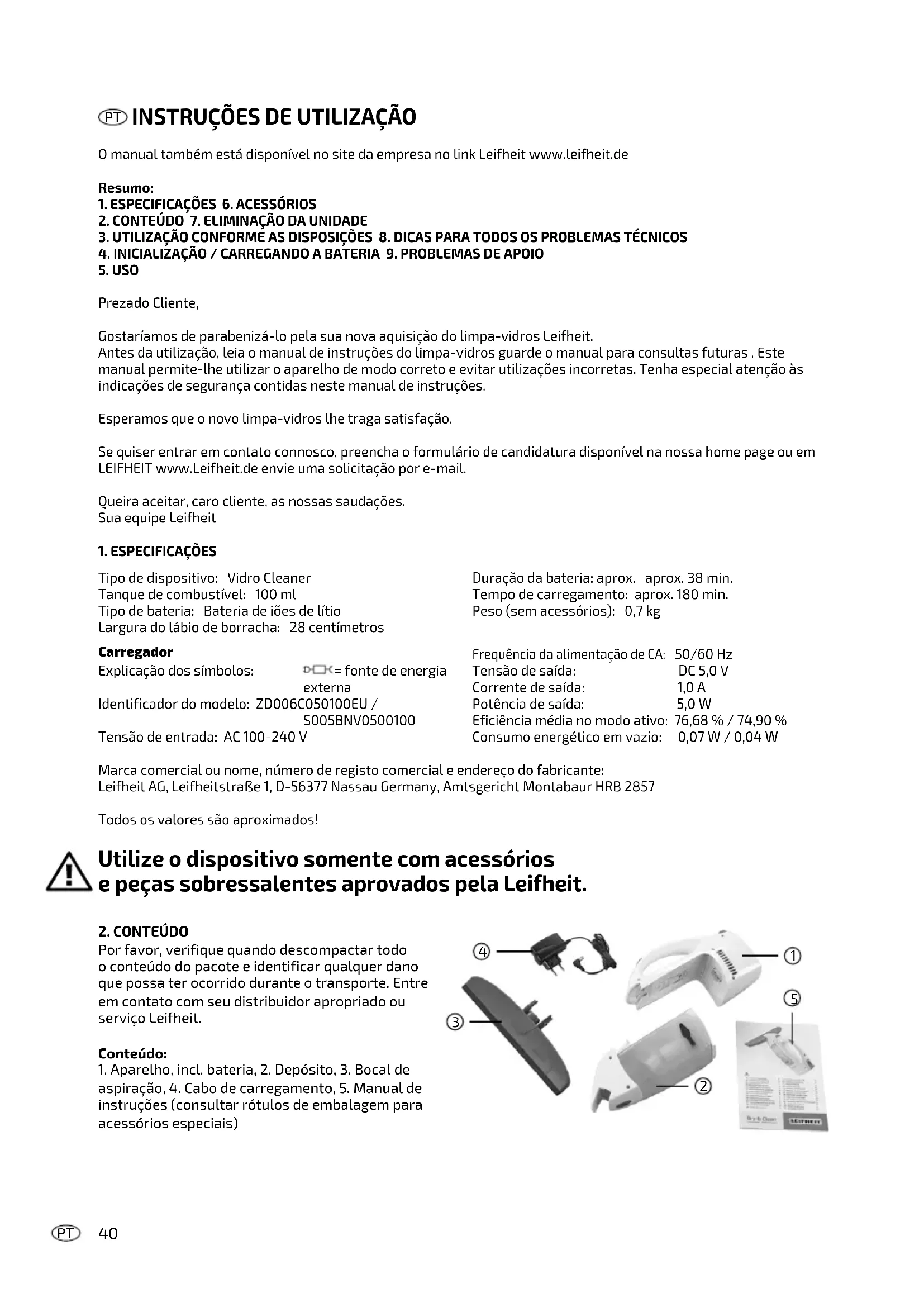 Marca comercial ou nome, número de registo comercial e endereço do fabricante: Leifheit AG, Leifheitstraße 1, D-56377 Nassau Germany, Amtsgericht Montabaur HRB 2857 Todos os valores são aproximados! Utilize o dispositivo somente com acessórios e peças sobressalentes aprovados pela Leifheit. Tipo de dispositivo: Vidro Cleaner Tanque de combustível: 100 ml Tipo de bateria: Bateria de iões de lítio Largura do lábio de borracha: 28 centímetros Duração da bateria: aprox. aprox. 38 min. Tempo de carregamento: aprox. 180 min. Peso (sem acessórios): 0,7 kg Carregador Explicação dos símbolos: = fonte de energia externa Identificador do modelo: ZD006C050100EU / S005BNV0500100 Tensão de entrada: AC 100-240 V Frequência da alimentação de CA: 50/60 Hz Tensão de saída: DC 5,0 V Corrente de saída: 1,0 A Potência de saída: 5,0 W Eficiência média no modo ativo: 76,68 % / 74,90 % Consumo energético em vazio: 0,07 W / 0,04 W41