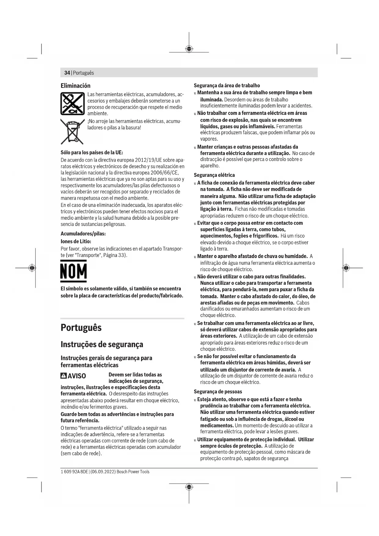 12,2 1,5 O nível de vibrações indicado nestas instruções e o valor de emissões sonoras foram medidos de acordo com um processo de medição normalizado e podem ser utilizados para a comparação de ferramentas elétricas. Também são adequados para uma avaliação provisória das emissões sonoras e de vibrações. O nível de vibrações indicado e o valor de emissões sonoras representam as aplicações principais da ferramenta elétrica. Se a ferramenta elétrica for utilizada para outras aplicações, com outras ferramentas de trabalho ou com manutenção insuficiente, é possível que o nível de vibrações e de emissões sonoras seja diferente. Isto pode aumentar sensivelmente a emissão sonora e de vibrações para o período completo de trabalho. Para uma estimação exata da emissão sonora e de vibrações, também deveriam ser considerados os períodos nos quais o aparelho está desligado ou funciona, mas não está sendo utilizado. Isto pode reduzir a emissão sonora e de vibrações durante o completo período de trabalho. Além disso também deverão ser estipuladas medidas de segurança para proteger o operador contra o efeito de vibrações, como por exemplo: manutenção de ferramentas elétricas e acessórios, manter as mãos quentes e organização dos processos de trabalho. Montagem u A bateria deverá ser retirada antes de todos os trabalhos na ferramenta elétrica (p. ex. manutenção, troca de ferramenta etc.) e antes de transportar ou de armazenar a mesma. Há perigo de ferimentos se o interruptor de ligar/desligar for acionado involuntariamente. Carregar a bateria u Utilize apenas os carregadores listados nos dados técnicos. Só estes carregadores são apropriados para os baterias de lítio utilizadas para a sua ferramenta elétrica. Nota: A bateria é fornecida parcialmente carregada. Para assegurar a completa potência da bateria, a bateria deverá ser carregada completamente no carregador antes da primeira utilização. A bateria de lítio pode ser carregada a qualquer altura, sem que a sua vida útil seja reduzida. Uma interrupção do processo de carga não danifica a bateria. O acumulador de iões de lítio está protegido contra descarga completa pelo sistema "Electronic Cell Protection (ECP)". A ferramenta elétrica é desligada através de um disjuntor de proteção, logo que o acumulador estiver descarregado. A ferramenta de trabalho não se movimenta mais. Observe as indicações sobre a eliminação de forma ecológica. Retirar a bateria A bateria (7) possui dois níveis de travamento, que devem evitar, que a bateria caia, caso a tecla de desbloqueio (8) seja premida por acaso. Enquanto a bateria estiver dentro da ferramenta elétrica, ela é mantido em posição por uma mola. Para retirar a bateria (7) pressione a tecla de desbloqueio (8) e puxe a bateria para a retirar da ferramenta elétrica. Não empregar força. Indicador do nível de carga da bateria Os LEDs verdes do indicador do nível de carga da bateria indicam o nível de carga da bateria. Por motivos de segurança, a consulta do nível de carga só é possível com a ferramenta elétrica parada. Prima a tecla para o indicador do nível de carga da bateria ou para visualizar o nível de carga. Isto também é possível com a bateria removida. Se, depois de premir a tecla para o indicador do nível de carga da bateria, não se acender qualquer LED, a bateria tem defeito e tem de ser substituída. Tipo de bateria GBA 18V... LEDs Capacidade Luz permanente 3× verde 60–100% Luz permanente 2× verde 30–60% Luz permanente 1× verde 5–30% Luz intermitente 1× verde 0–5% Tipo de bateria ProCORE18V... LEDs Capacidade Luz permanente 5× verde 80−100% Luz permanente 4× verde 60−80% Luz permanente 3× verde 40−60% Luz permanente 2× verde 20−40% Luz permanente 1× verde 5−20% Luz intermitente 1× verde 0−5% 1 609 92A 8DE | (06.09.2022) Bosch Power ToolsPortuguês | 39 Troca de ferramenta (ver figura A) u A bateria deverá ser retirada antes de todos os trabalhos na ferramenta elétrica (p. ex. manutenção, troca de ferramenta etc.) e antes de transportar ou de armazenar a mesma. Há perigo de ferimentos se o interruptor de ligar/desligar for acionado involuntariamente. Com o interruptor de ligar/desligar não pressionado (11) é fixado o veio de perfuração. Isto possibilita uma troca rápida, confortável e fácil da ferramenta de trabalho no mandril de brocas. Abra a bucha de aperto rápido (2) rodando no sentido ➊ até a ferramenta poder ser inserida. Introduzir a ferramenta. Aperte bem à mão a bucha da bucha de aperto rápido (2) no sentido de rotação ➋. A bucha fica assim automaticamente bloqueada. Aspiração de pó/de aparas Pós de materiais como por exemplo, tintas que contém chumbo, alguns tipos de madeira, minerais e metais, podem ser nocivos à saúde. O contacto ou a inalação dos pós pode provocar reações alérgicas e/ou doenças nas vias respiratórias do utilizador ou das pessoas que se encontrem por perto. Certos pós, como por exemplo pó de carvalho e faia são considerados como sendo cancerígenos, especialmente quando juntos com substâncias para o tratamento de madeiras (cromato, preservadores de madeira). Material que contém asbesto só deve ser processado por pessoal especializado. – Assegurar uma boa ventilação do local de trabalho. – É recomendável usar uma máscara de proteção respiratória com filtro da classe P2. Observe as diretivas para os materiais a serem processados, vigentes no seu país. u Evite a acumulação de pó no local de trabalho. Pós podem entrar levemente em ignição. Funcionamento Colocação em funcionamento Colocar a bateria Nota: A utilização de baterias não indicadas para a sua ferramenta elétrica pode causar falhas de funcionamento ou danos na ferramenta elétrica. Introduza a bateria (7) carregada pela frente, na base da ferramenta elétrica, até a bateria estar travada com firmeza. Ajust