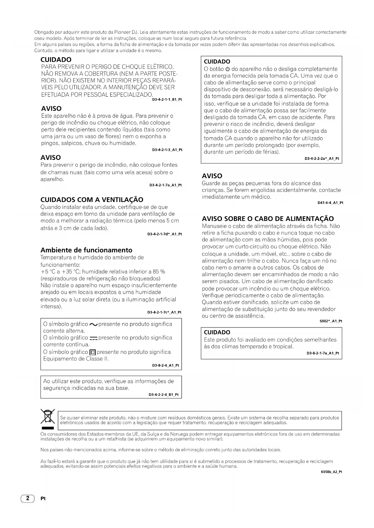 Obrigado por adquirir este produto da Pioneer DJ. Leia atentamente estas instruções de funcionamento de modo a saber como utilizar correctamente oseu modelo. Após terminar de ler as instruções, coloque-as num local seguro para futura referência. Em alguns países ou regiões, a forma da ficha de alimentação e da tomada por vezes podem diferir das apresentadas nos desenhos explicativos. Contudo, o método para ligar e utilizar a unidade é o mesmo. CUIDADO PARA PREVENIR O PERIGO DE CHOQUE ELÉTRICO, NÃO REMOVA A COBERTURA (NEM A PARTE POSTE- RIOR). NÃO EXISTEM NO INTERIOR PEÇAS REPARÁ- VEIS PELO UTILIZADOR. A MANUTENÇÃO DEVE SER EFETUADA POR PESSOAL ESPECIALIZADO. D3-4-2-1-1_B1_Pt AVISO Este aparelho não é à prova de água. Para prevenir o perigo de incêndio ou choque elétrico, não coloque perto dele recipientes contendo líquidos (tais como uma jarra ou um vaso de flores) nem o exponha a pingos, salpicos, chuva ou humidade. D3-4-2-1-3_A1_Pt AVISO Para prevenir o perigo de incêndio, não coloque fontes de chamas nuas (tais como uma vela acesa) sobre o aparelho. D3-4-2-1-7a_A1_Pt AVISO Guarde as peças pequenas fora do alcance das crianças. Se forem engolidas acidentalmente, contacte imediatamente um médico. D41-6-4_A1_Pt Ambiente de funcionamento Temperatura e humidade do ambiente de funcionamento: +5 °C a +35 °C; humidade relativa inferior a 85 % (respiradouros de refrigeração não bloqueados) Não instale o aparelho num espaço insuficientemente arejado ou em locais expostos a uma humidade elevada ou a luz solar direta (ou a iluminação artificial intensa). D3-4-2-1-7c*_A1_Pt CUIDADO O botão do aparelho não o desliga completamente da energia fornecida pela tomada CA. Uma vez que o cabo de alimentação serve como o principal dispositivo de desconexão, será necessário desligá-lo da tomada para desligar toda a alimentação. Por isso, verifique se a unidade foi instalada de forma que o cabo de alimentação possa ser facilmente desligado da tomada CA, em caso de acidente. Para prevenir o risco de incêndio, deverá desligar igualmente o cabo de alimentação de energia da tomada CA quando o aparelho não for utilizado durante um período prolongado (por exemplo, durante um período de férias). D3-4-2-2-2a*_A1_Pt Ao utilizar este produto, verifique as informações de segurança indicadas na sua base. D3-4-2-2-4_B1_Pt