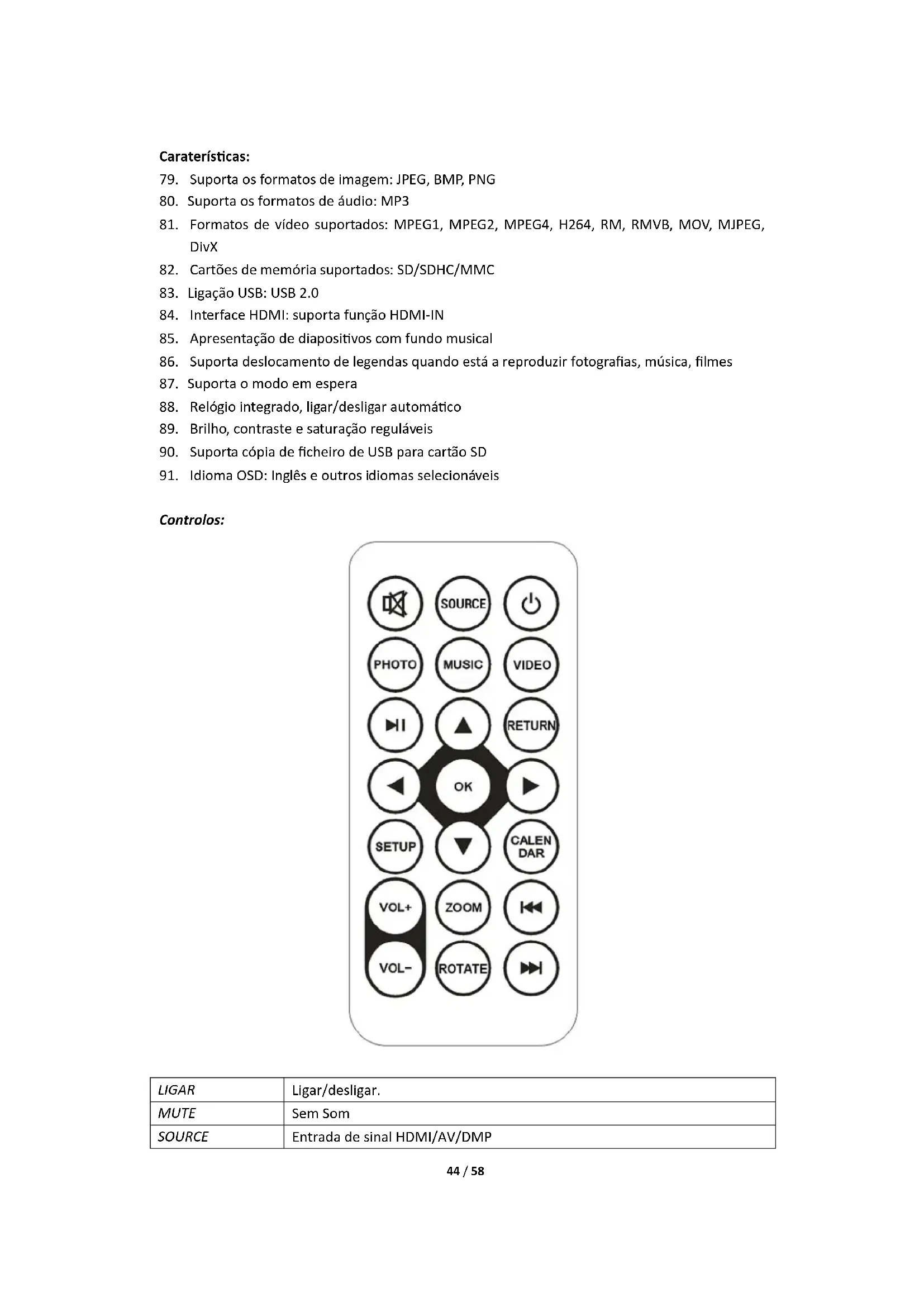 Suporta SD/SDHC/MMC e USB 2.0. Premir para aceder aos menus das fotografias, música, video, calendário e definições. Premir OK para confirmar a seleção.