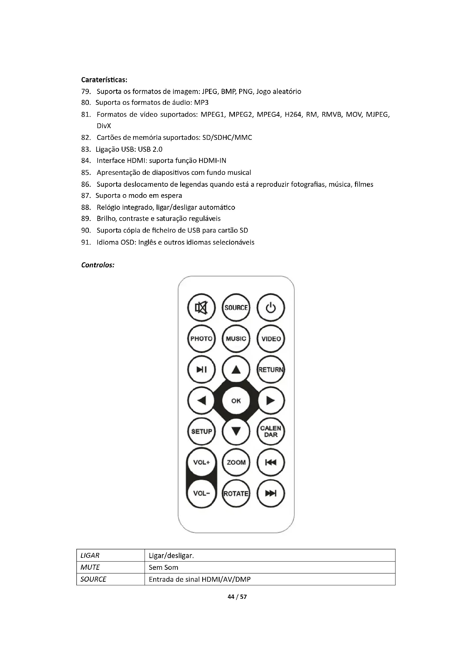 Suporta SD/SDHC/MMC e USB 2.0. Premir para aceder aos menus das fotografias, música, video, calendário e definições. Premir OK para confirmar a seleção.